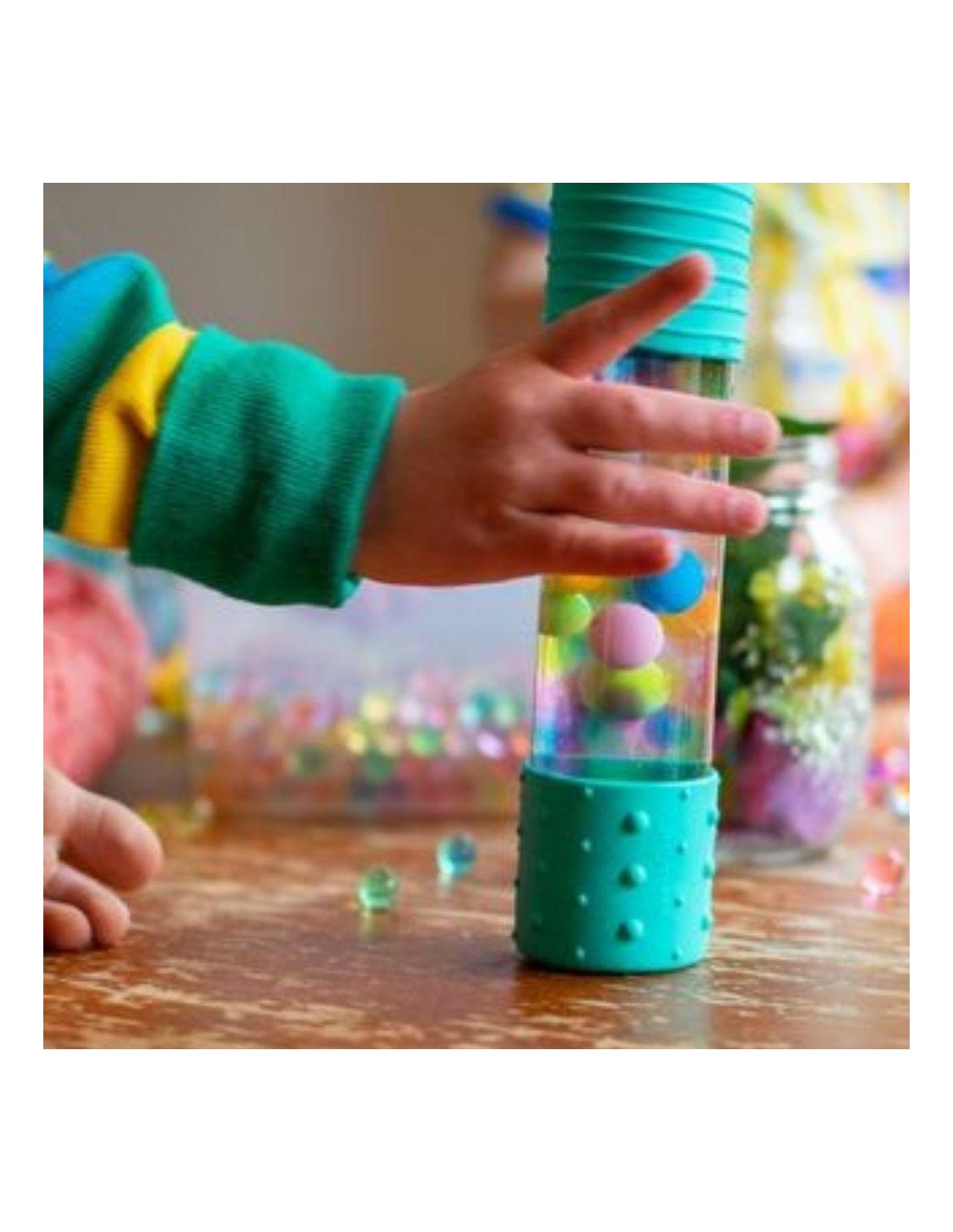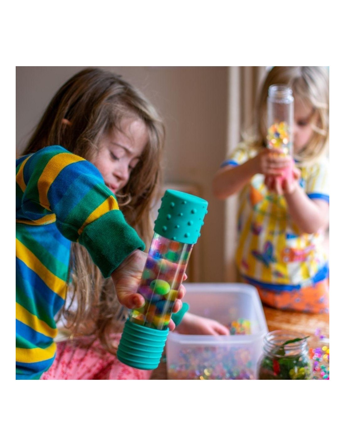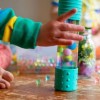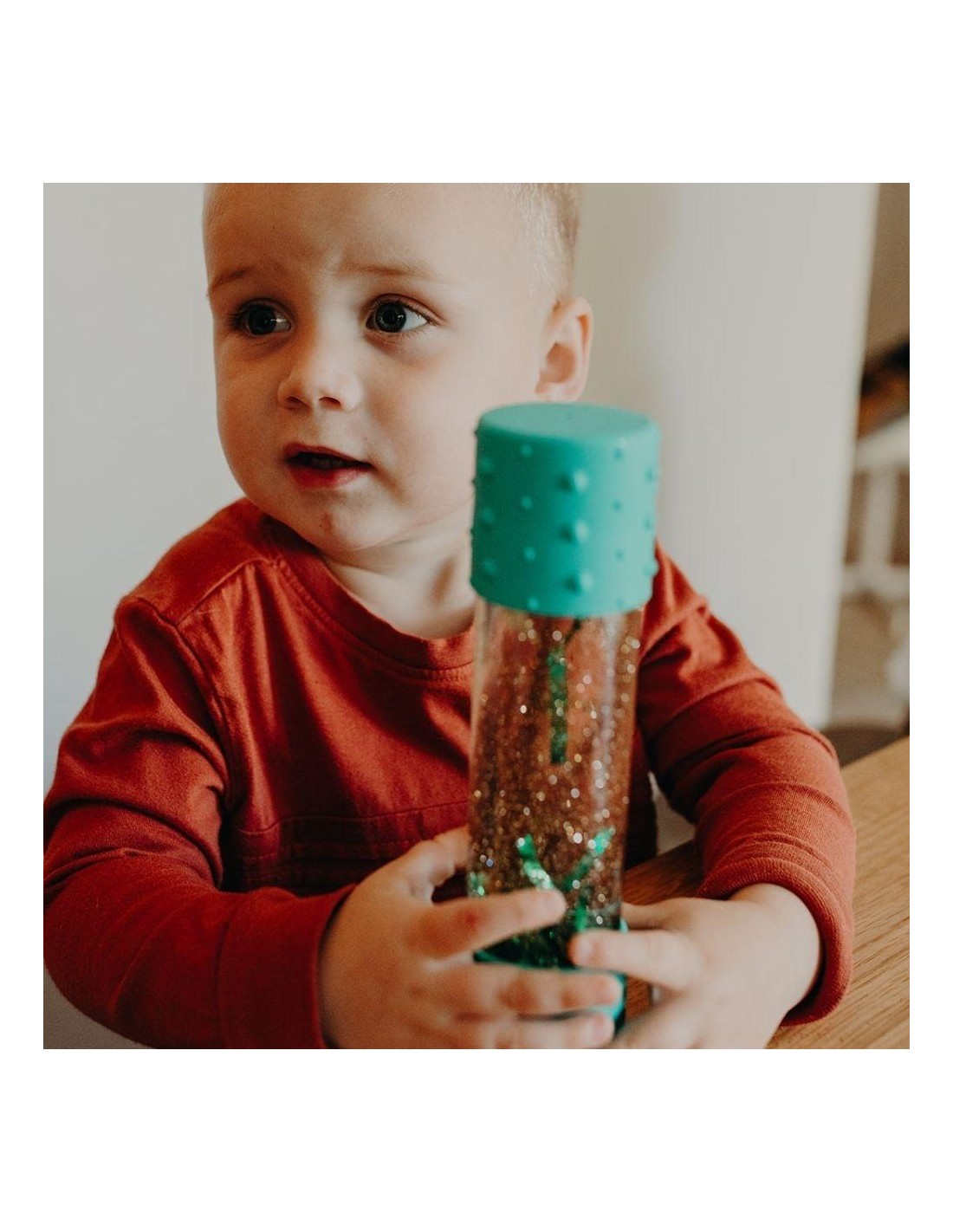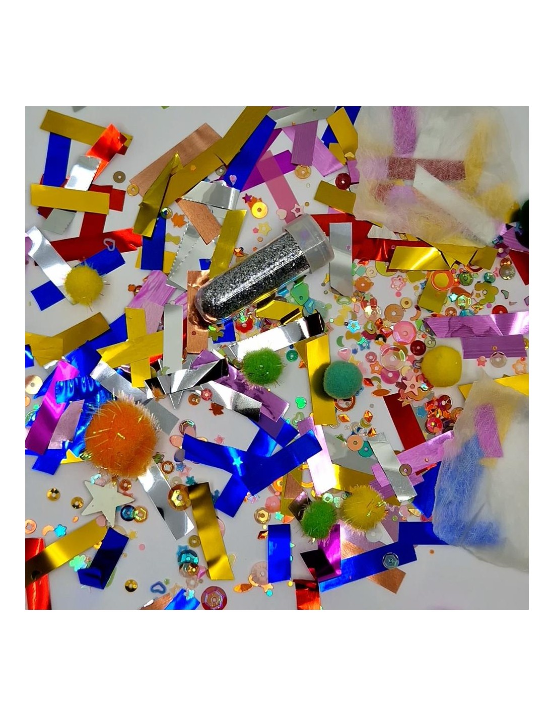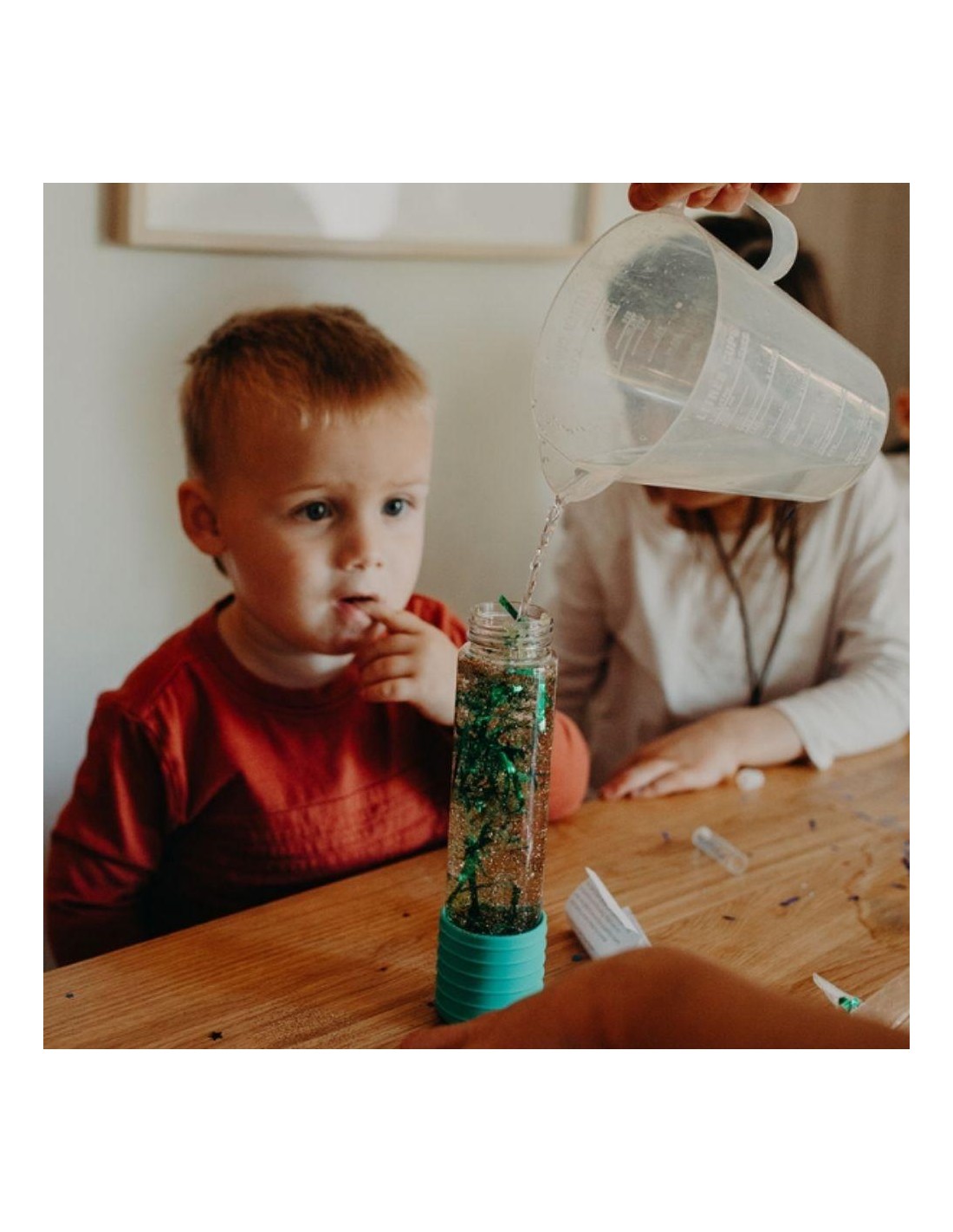 El kit incluye todos los elementos necesarios para confeccionar tu propia botella sensorial. Solo tienes que añadir agua tibia y los accesorios incluidos: confeti, purpurina y pequeños juguetes. ¡Montarla es tan divertido como jugar con ella! Se recomienda la ayuda de un adulto para los más pequeños. Una vez lista, puedes reinventarla cambiando el agua y añadiendo abalorios, colorantes o pequeños objetos que tengas en casa.