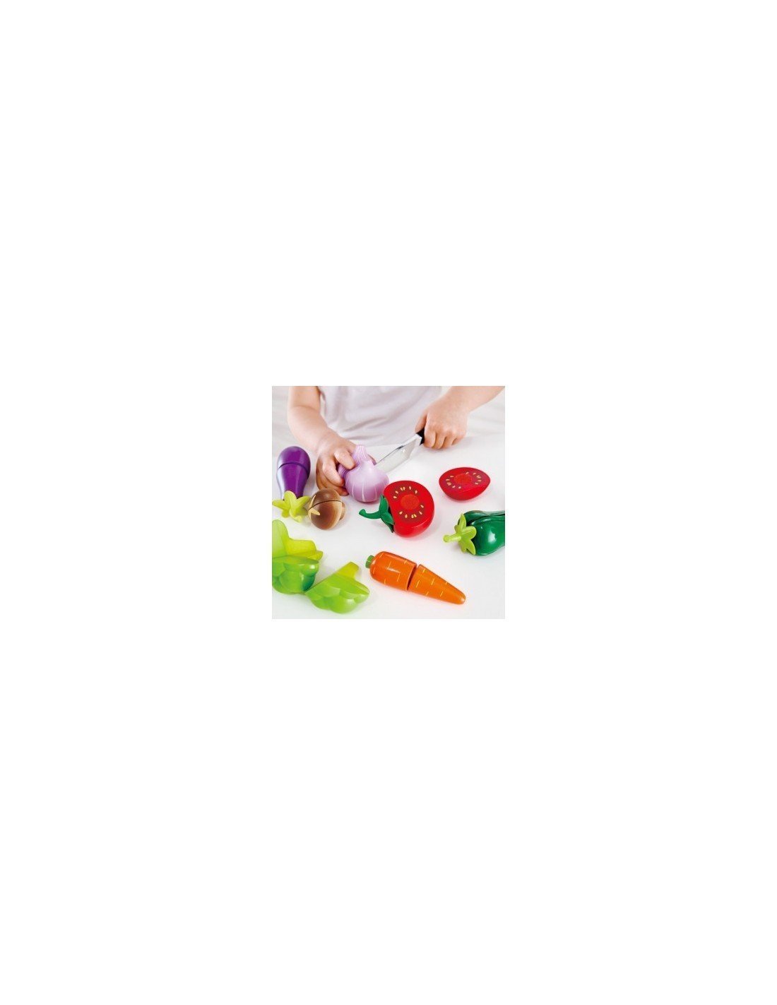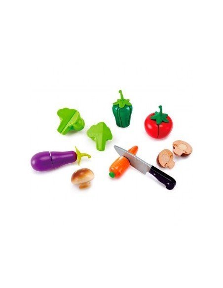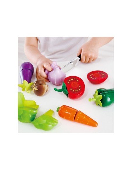 El huerto de verduras para cortar es un juguete de juego simbólico que permite a los peques “preparar” sus propias verduras. Incluye diferentes piezas (zanahoria, tomate, pepino, etc.) que se pueden cortar gracias a un sistema de unión (normalmente velcro o imán), acompañado de un cuchillo de juguete adaptado.