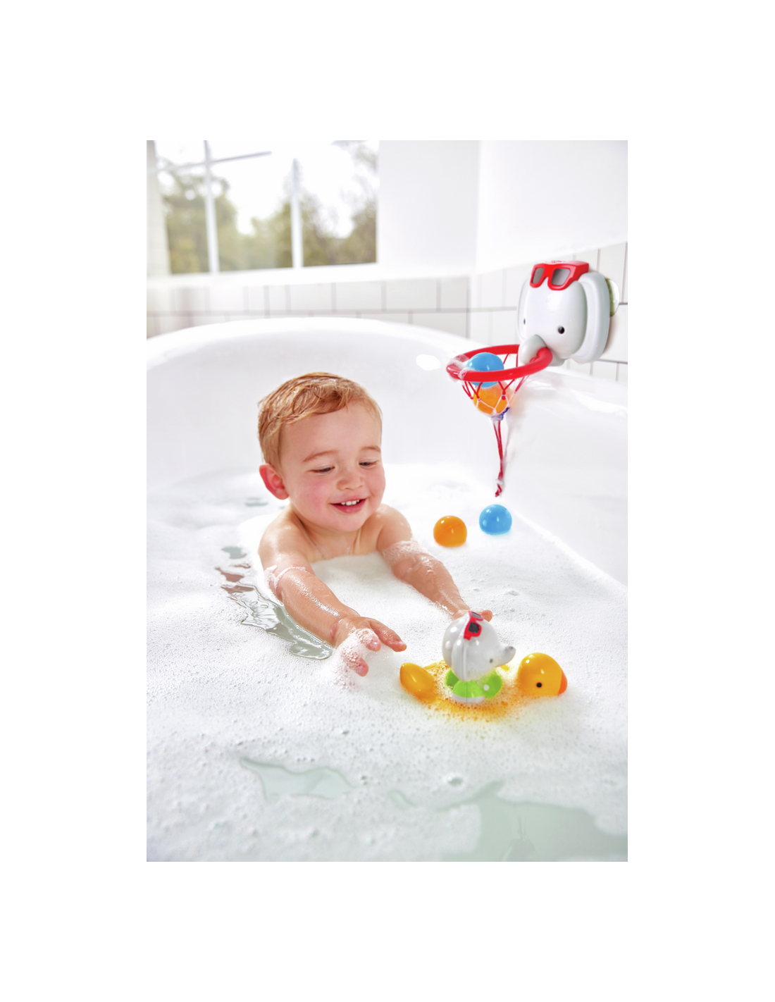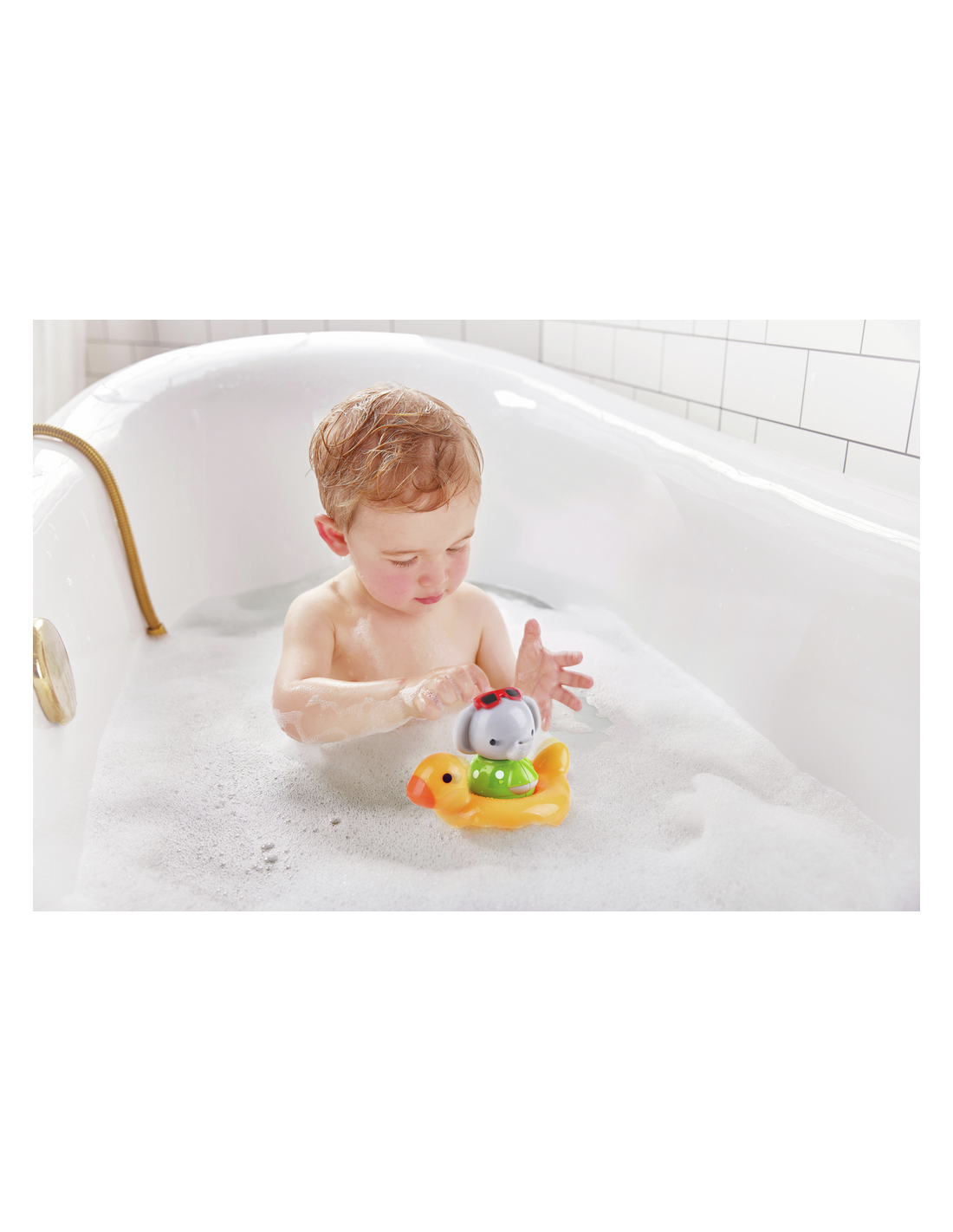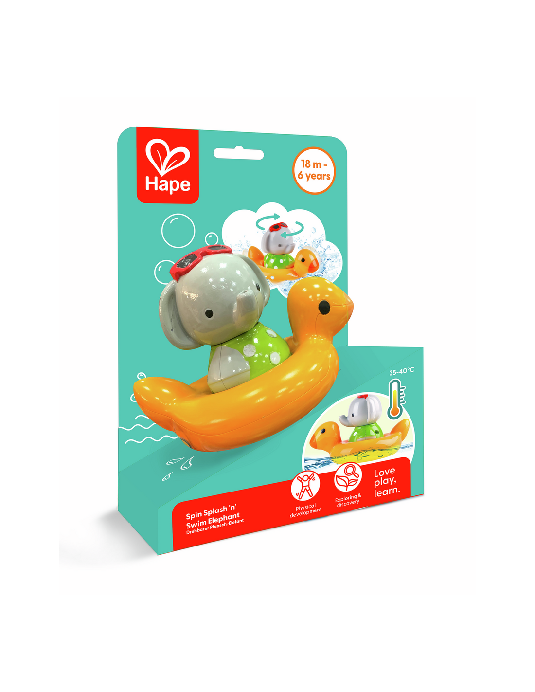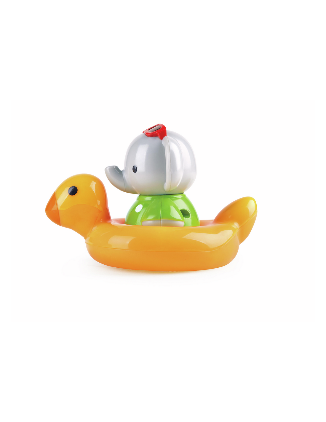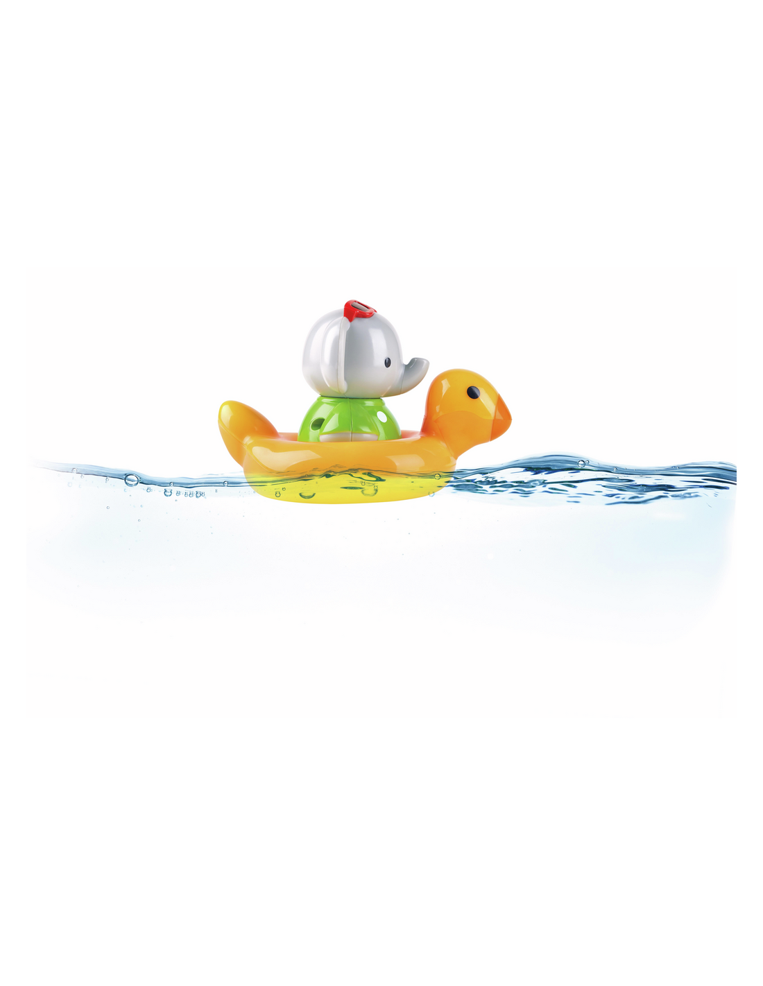 ¡Este divertido elefante que gira es el compañero perfecto para la bañera! Simplemente dale cuerda, siéntalo en el flotador de patito y mira cómo gira alegremente.