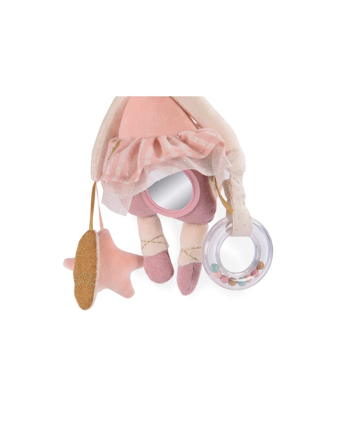 Gracias a su práctico lazo de sujeción, se puede colgar fácilmente en la cuna, el cochecito o la silla del coche, convirtiéndola en el entretenimiento perfecto para cualquier momento del día.
