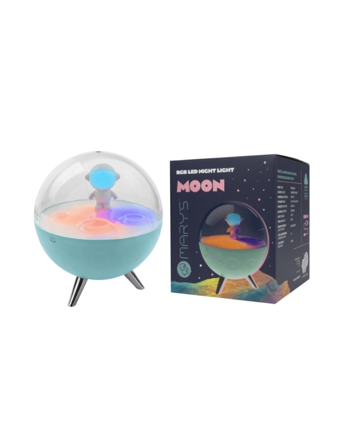 La lámpara de noche LED RGB Luna Azul de Mary’s crea un ambiente cálido y relajante gracias a sus cambios de color suaves, ideales para acompañar rutinas de descanso, momentos de calma o la hora del cuento.
