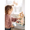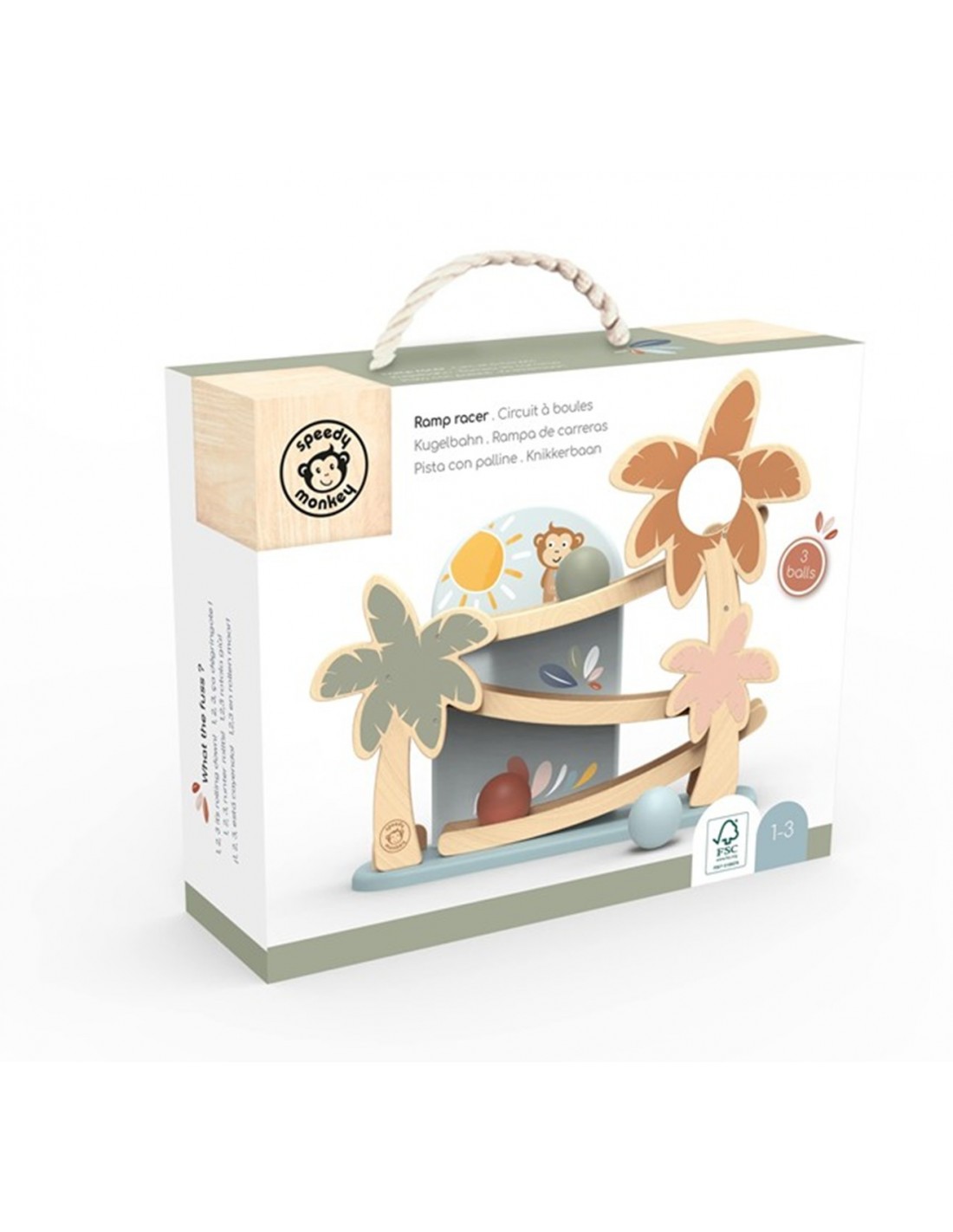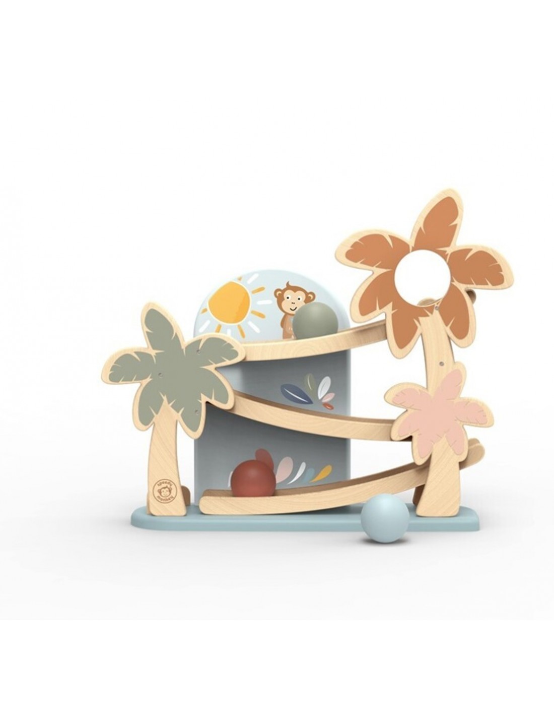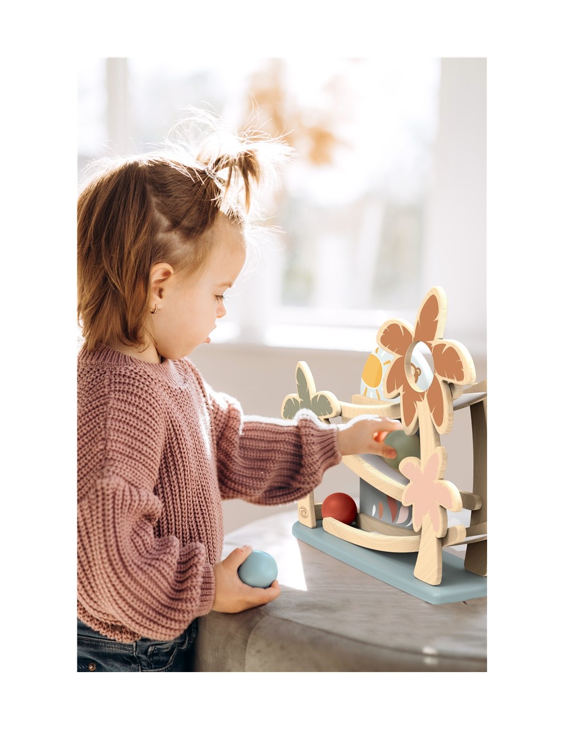 Su diseño vertical, con rampas suaves y elementos decorativos inspirados en la naturaleza, favorece la observación, la atención y la repetición consciente del gesto. Manipular las bolas, seguirlas con la mirada y anticipar su recorrido contribuye al desarrollo de la coordinación mano-ojo, la motricidad fina y la concentración.
