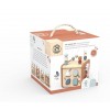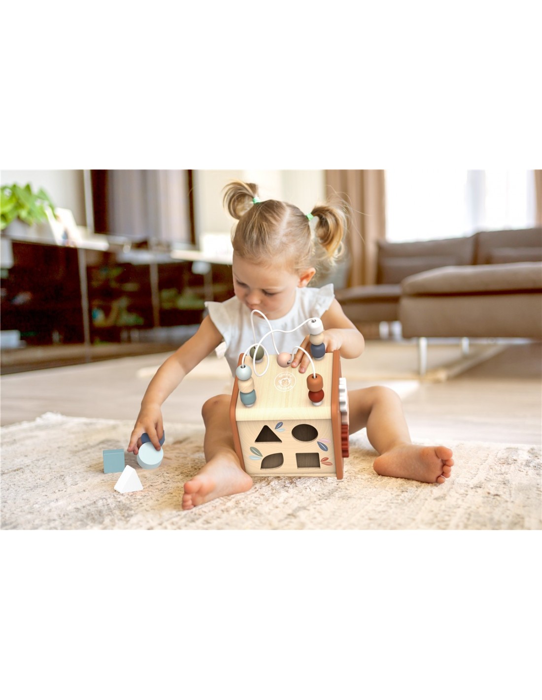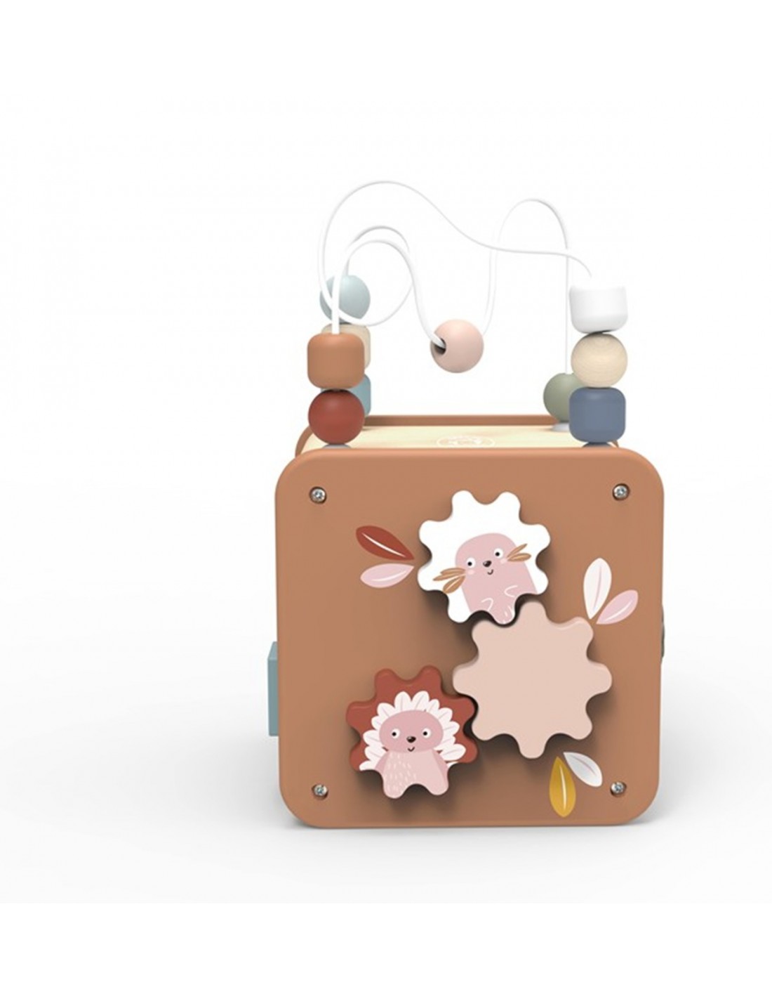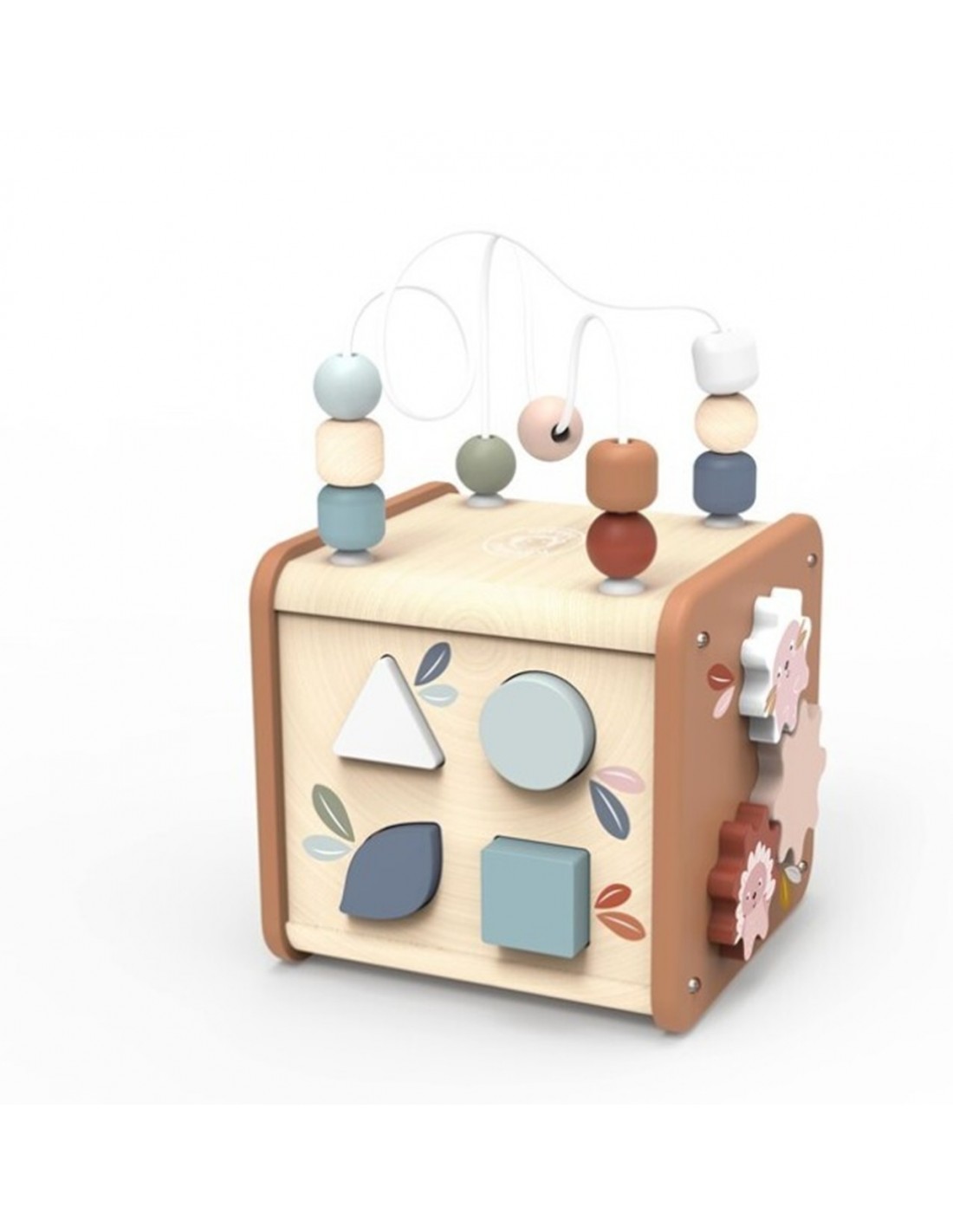 Incluye actividades como laberinto de cuentas, encajables de formas, engranajes y elementos móviles que favorecen la motricidad fina, la coordinación mano-ojo y la resolución de pequeños retos. Cada cara propone una experiencia distinta, lo que mantiene el interés y anima al juego autónomo y repetitivo, tan importante en la primera infancia.