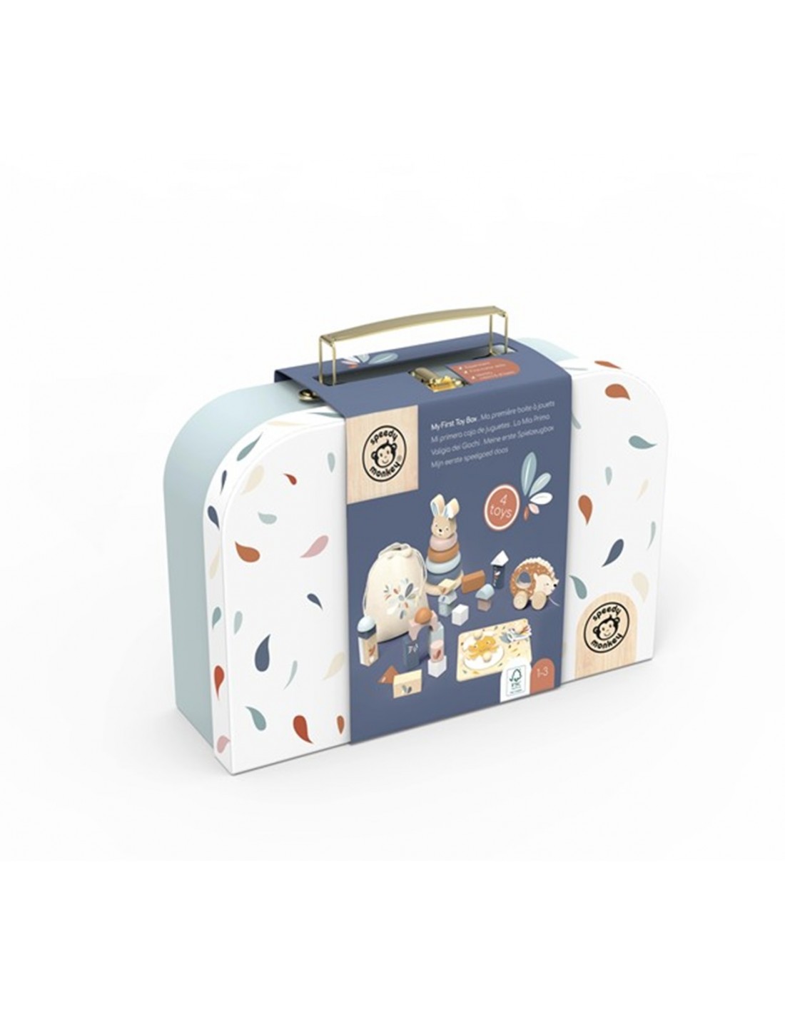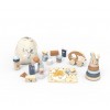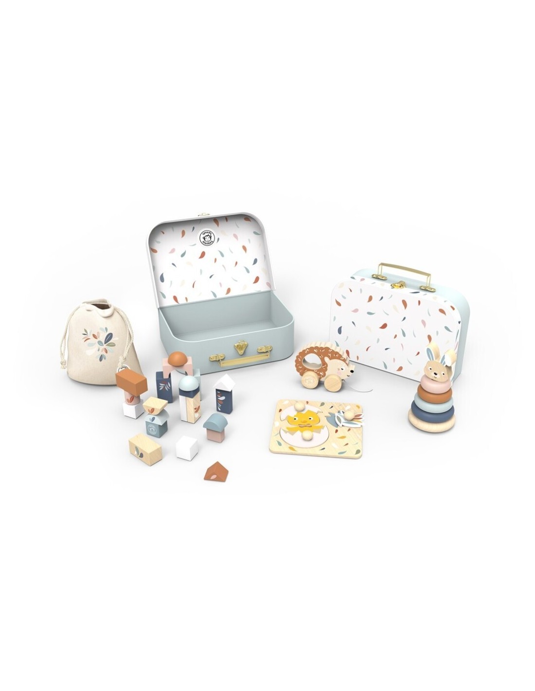 Mi primera caja de juguetes es un set pensado para acompañar los primeros descubrimientos del bebé a través del juego libre, manipulativo y sensorial. Incluye una cuidada selección de piezas de madera adaptadas a manos pequeñas, presentadas en una práctica caja tipo maletín que facilita el orden y el transporte.