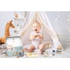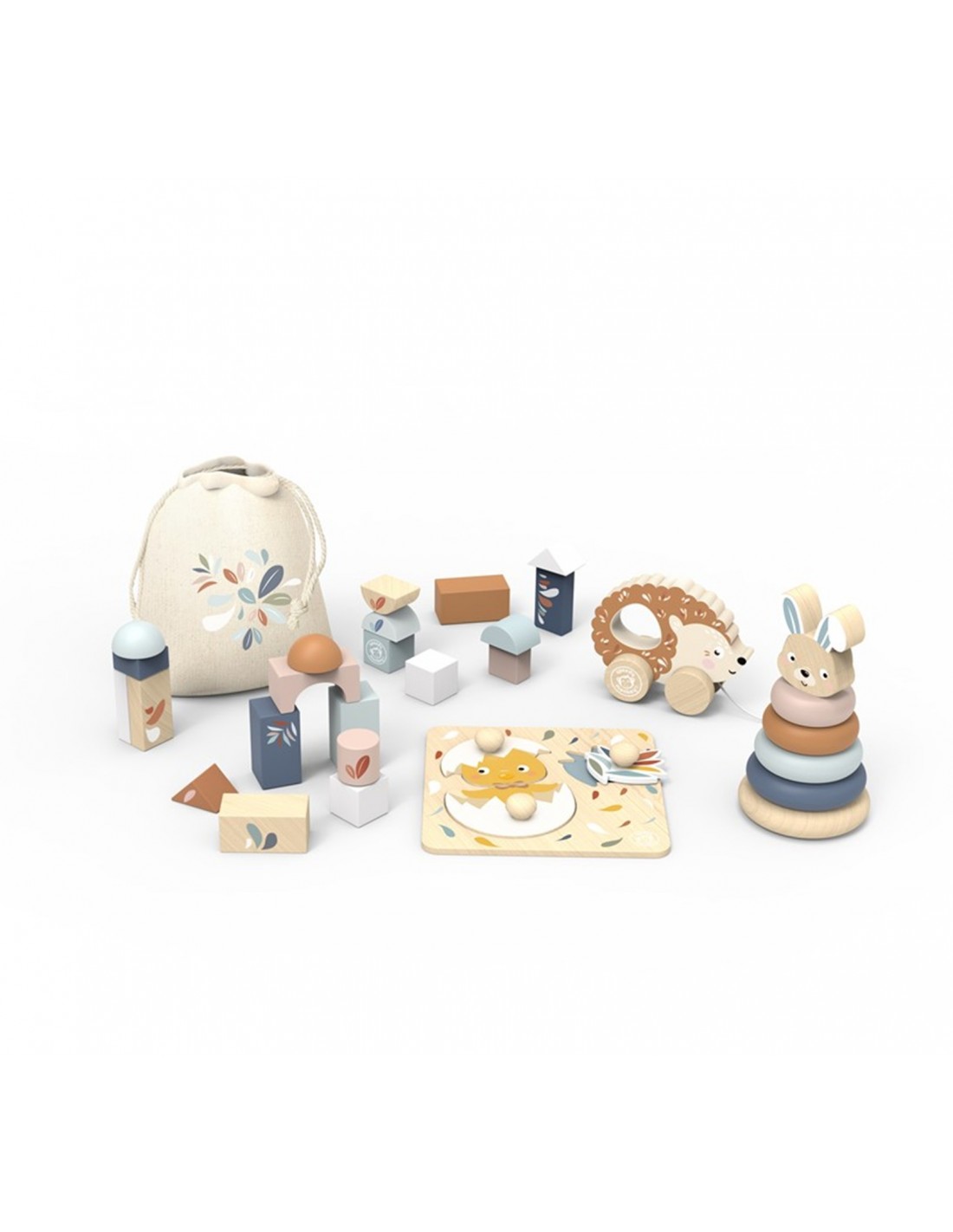 El conjunto invita a apilar, encajar, clasificar y explorar, favoreciendo la experimentación sin normas cerradas. Las diferentes formas, colores suaves y texturas estimulan la curiosidad natural del bebé y promueven un juego tranquilo y repetitivo, clave en esta etapa del desarrollo.