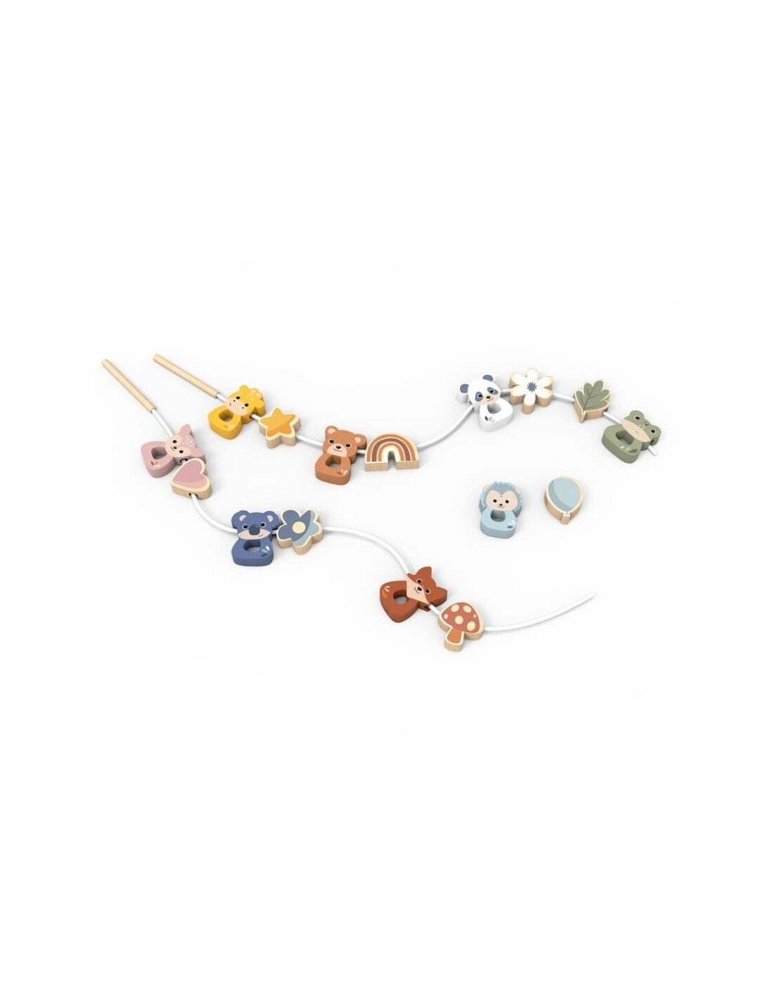 Este set de cuentas de madera con cordones invita a ensartar, combinar y crear secuencias llenas de color y formas divertidas. Animales, elementos naturales y figuras suaves acompañan a los peques en sus primeros retos de precisión.