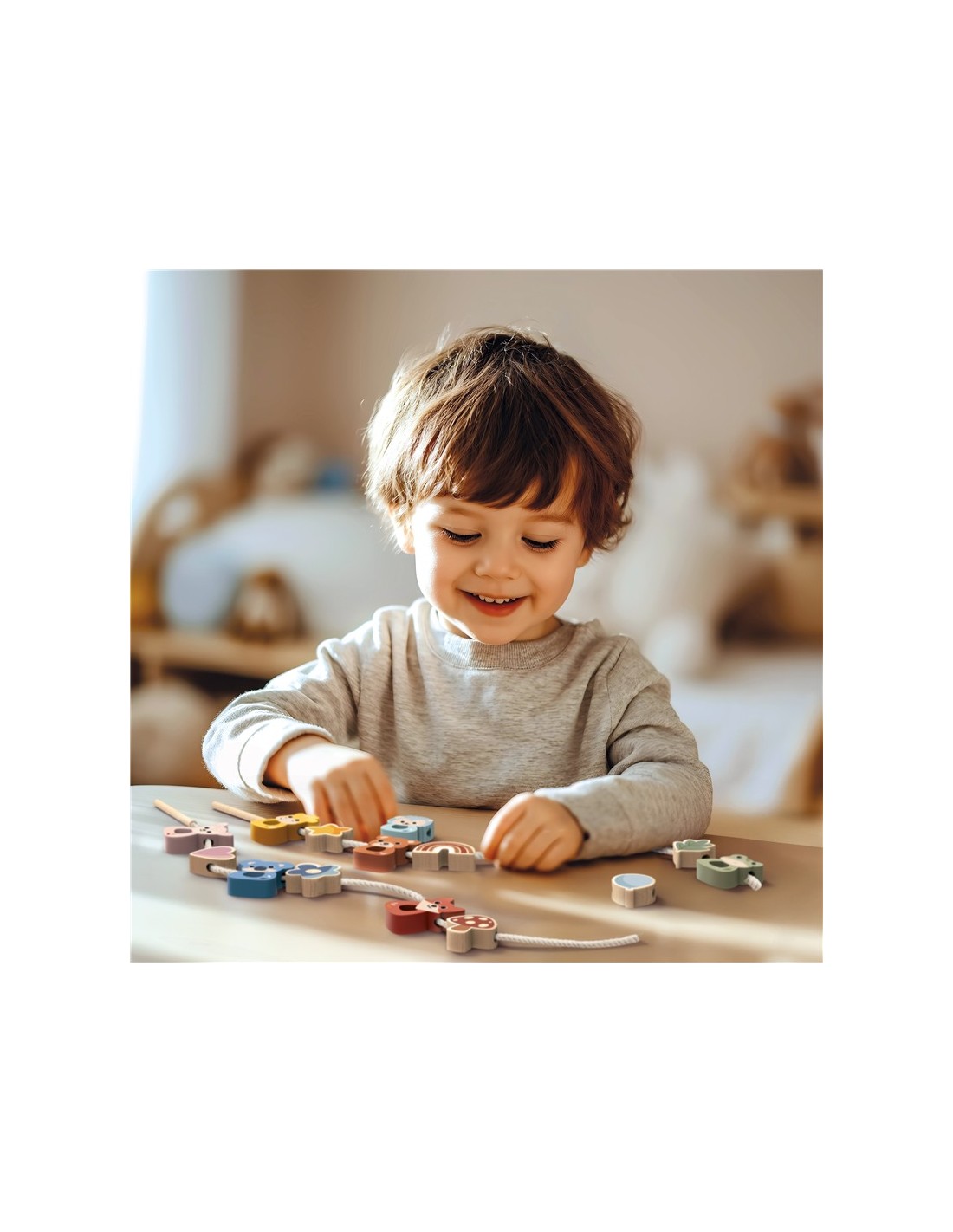 Ensartar no es solo pasar piezas por un cordón: es entrenar la paciencia, la coordinación y la atención al detalle. Además, permite crear patrones, clasificar por formas o colores e incluso inventar pequeñas historias con las figuras.