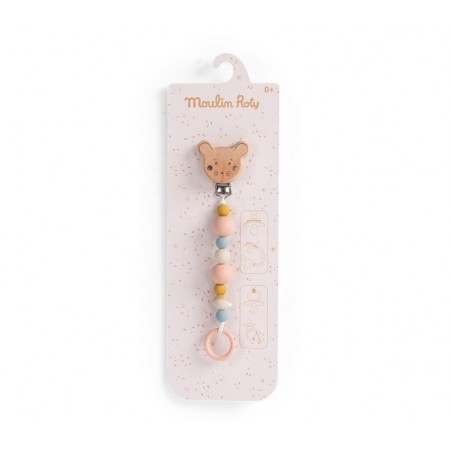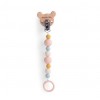 Un accesorio práctico y delicado para acompañar al bebé en su día a día. Este porta chupete combina madera natural con cuentas de silicona suave, creando un diseño seguro, funcional y muy agradable al tacto.