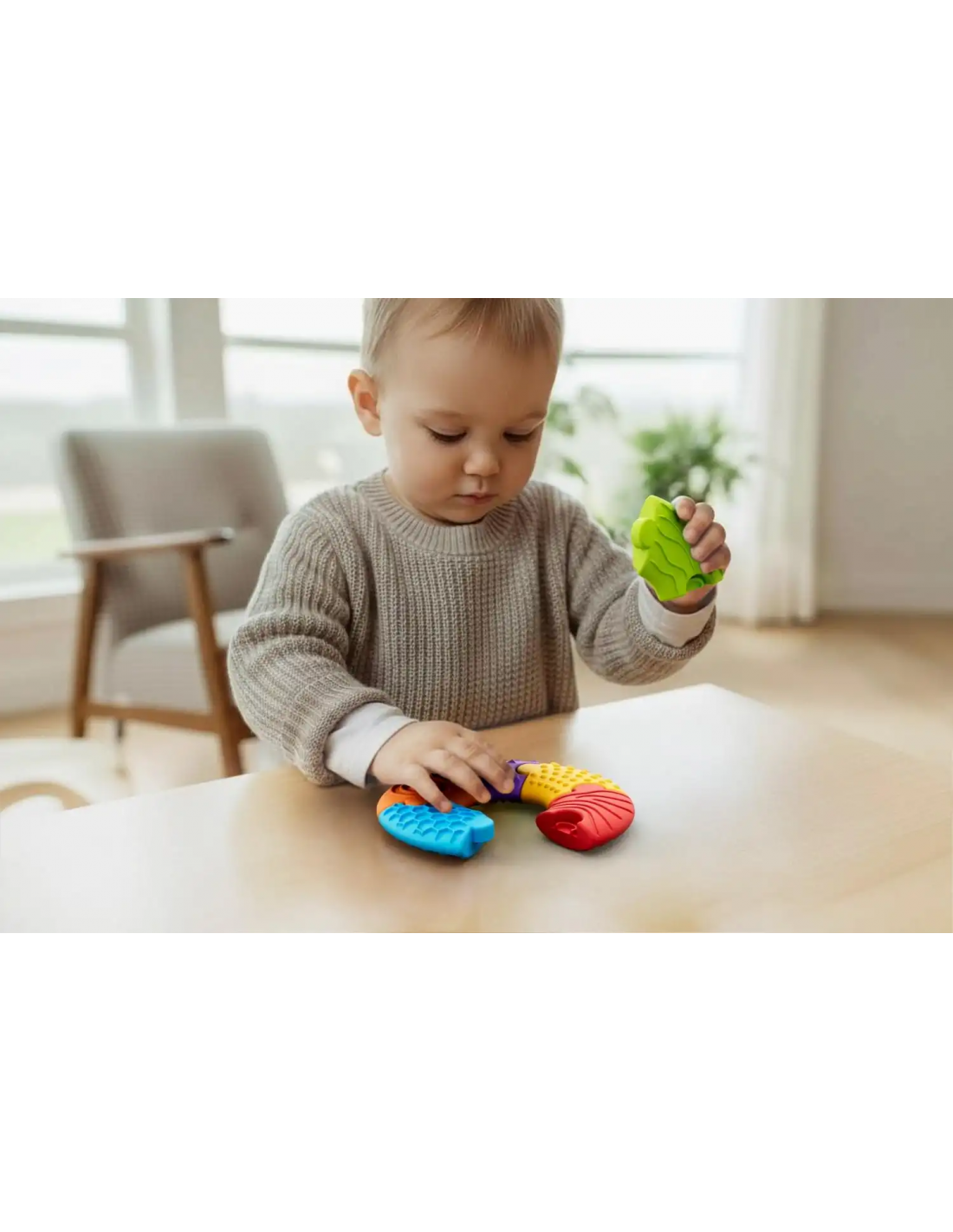Hecho de material suave y agradable al tacto, es perfecto como juguete para apilar, apretar y manipular, además de ser un elemento de la actividad sensorial diaria.