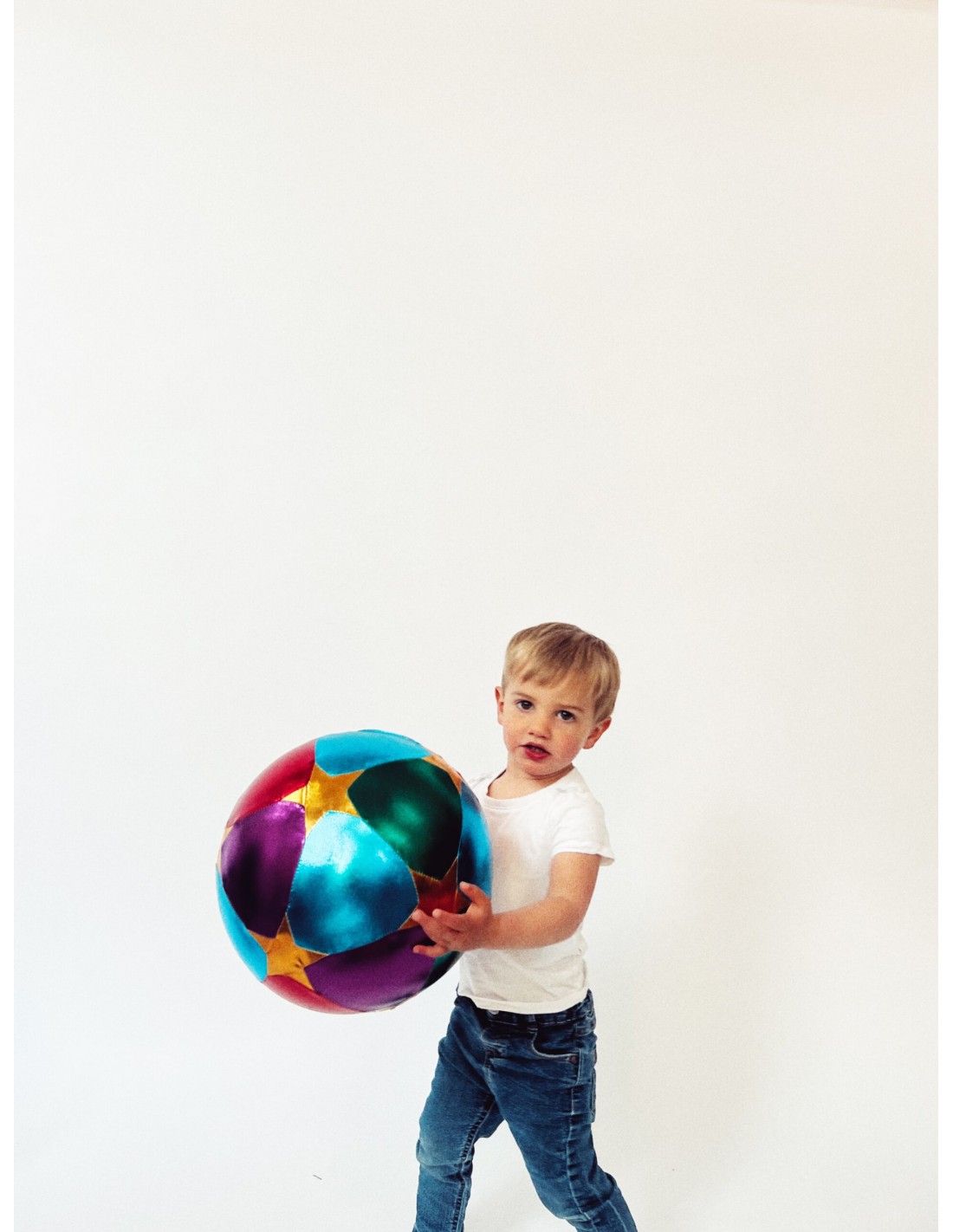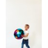 Pelota de tela suave y ligera con diseño multicolor, ideal para los primeros juegos de movimiento y exploración.