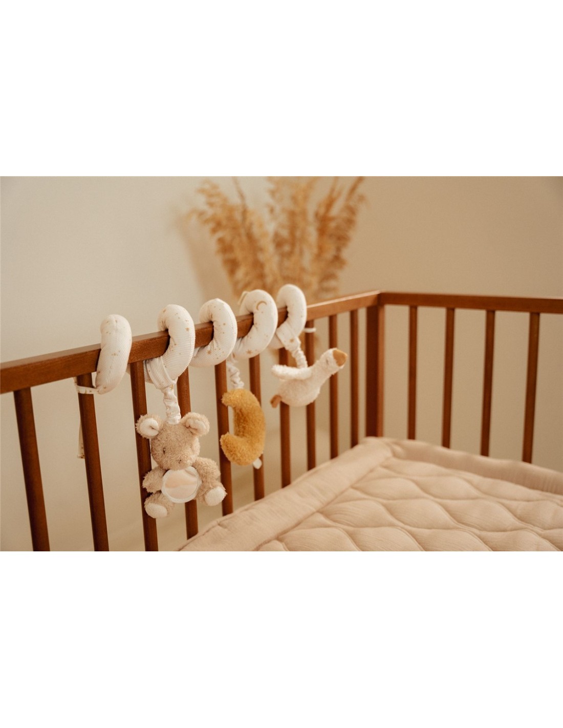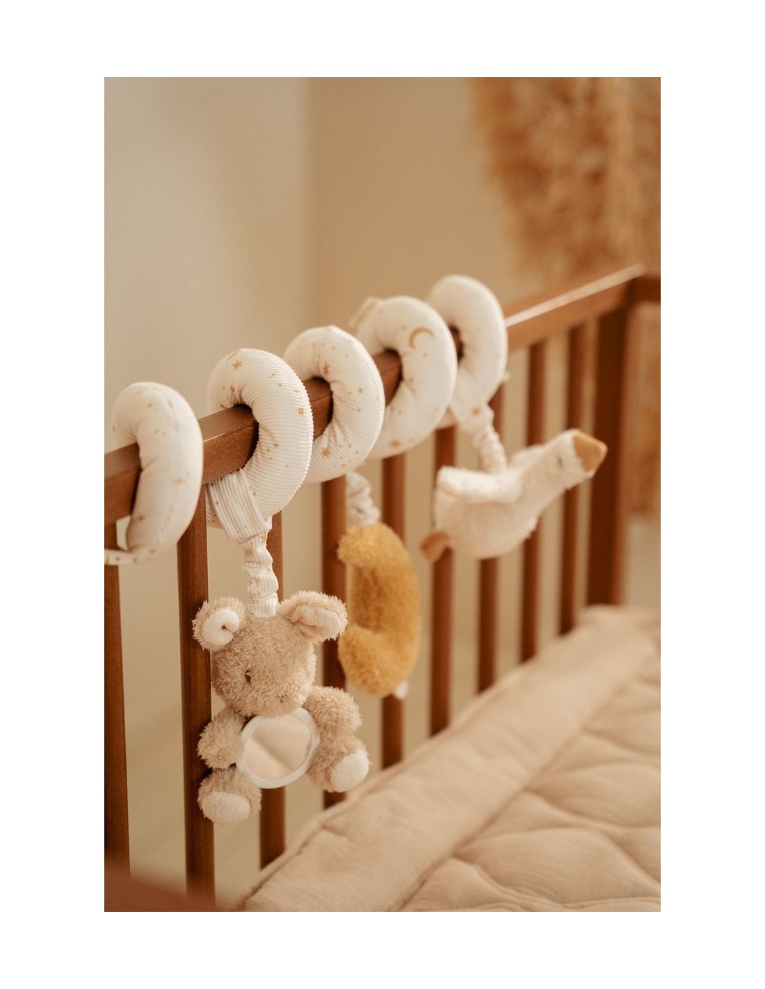 Esta delicada espiral de actividades está pensada para acompañar a los más pequeños desde sus primeros descubrimientos. Su diseño flexible permite colocarla fácilmente en la cuna, el carrito o la silla del coche, convirtiéndose en un estímulo constante allá donde vaya el bebé.