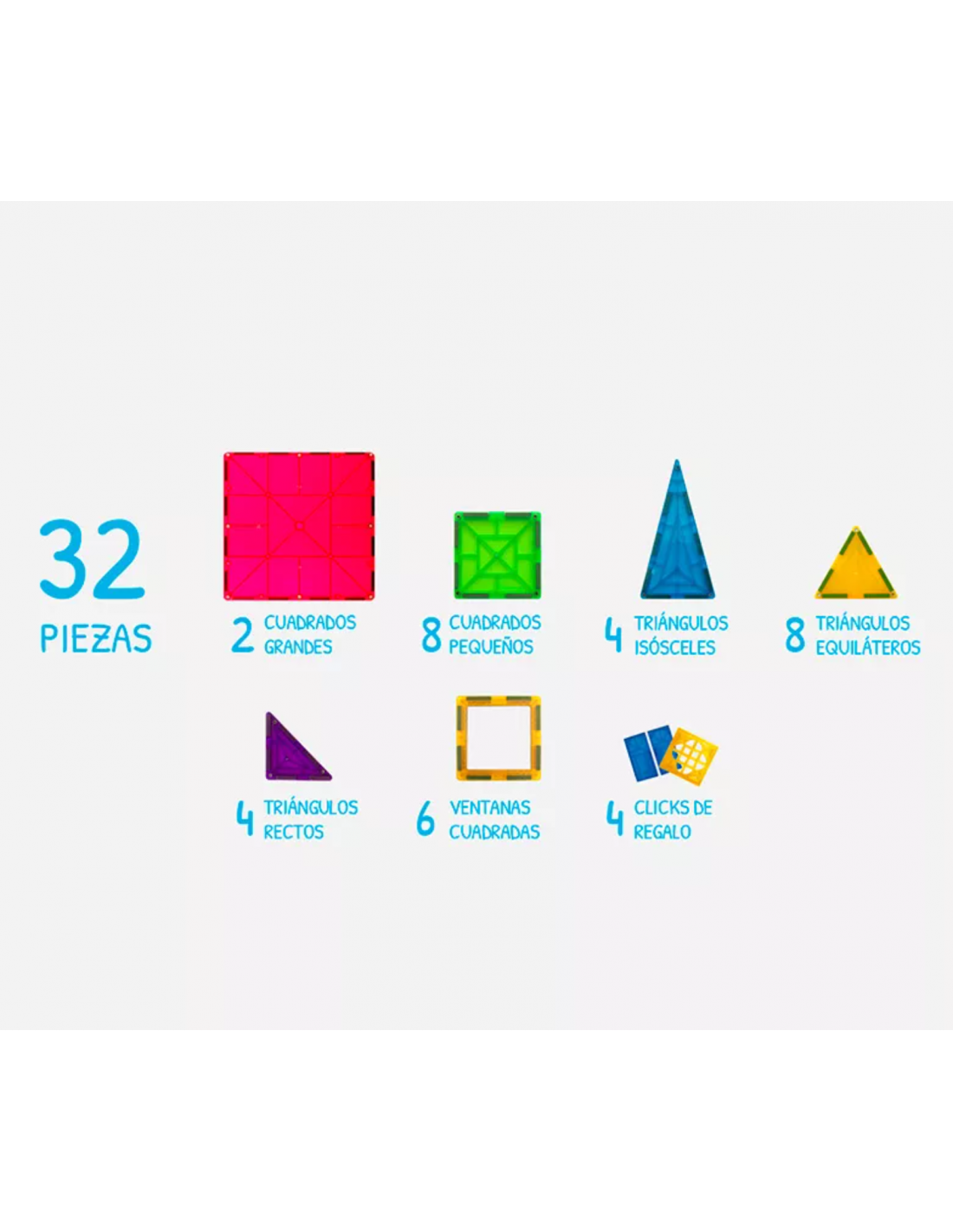 Gracias a sus colores, formas y fácil manipulación, los niños podrán crear infinitas construcciones (figuras planas, animales, flores, vehículos, torres, castillos...).