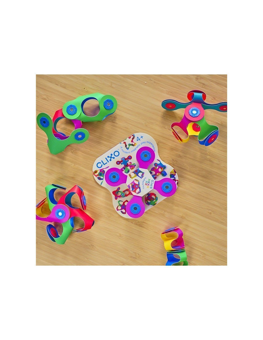9 piezas de la característica forma Quad de CLIXO para realizar más de 100 ocurrentes creaciones. Ya sea una serpiente, una corona, una bola o formas apilables. ¡Con este maravilloso kit de bolsillo encontrarás un mundo de formas y descubrimientos muy divertidos!