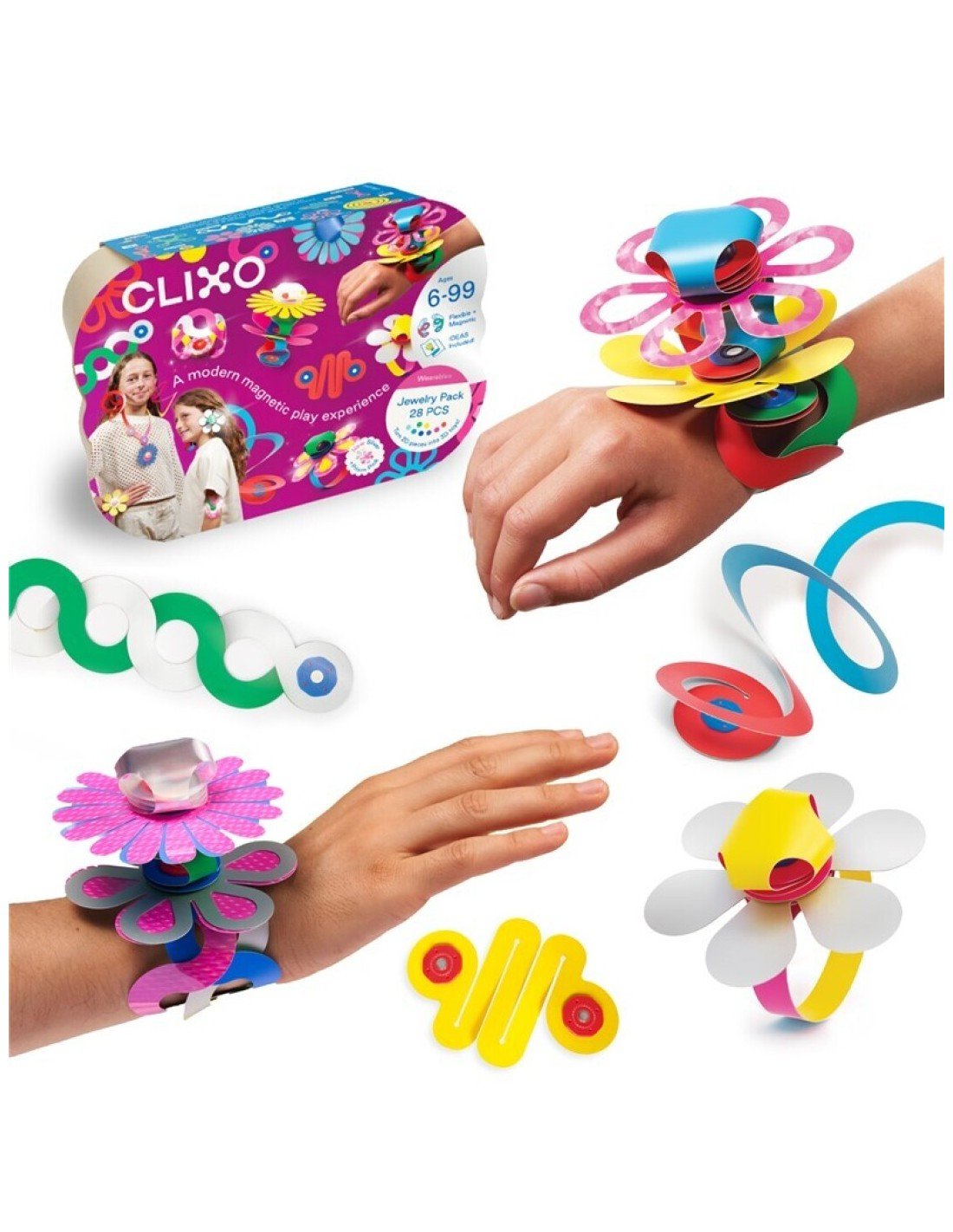 ¡Brilla con la magia del pack de joyas de Clixo! Las flores, prismas y colgantes especialmente diseñados dan vida a tus creaciones de joyería. Ya sea en casa o en la pasarela, las piezas magnéticas y flexibles de Clixo inspiran la creatividad y fomentan el aprendizaje STEAM. Crea de todo, desde deslumbrantes collares hasta elegantes pulseras y tocados. Deja que tu imaginación brille y descubre el poder del juego con Clixo.