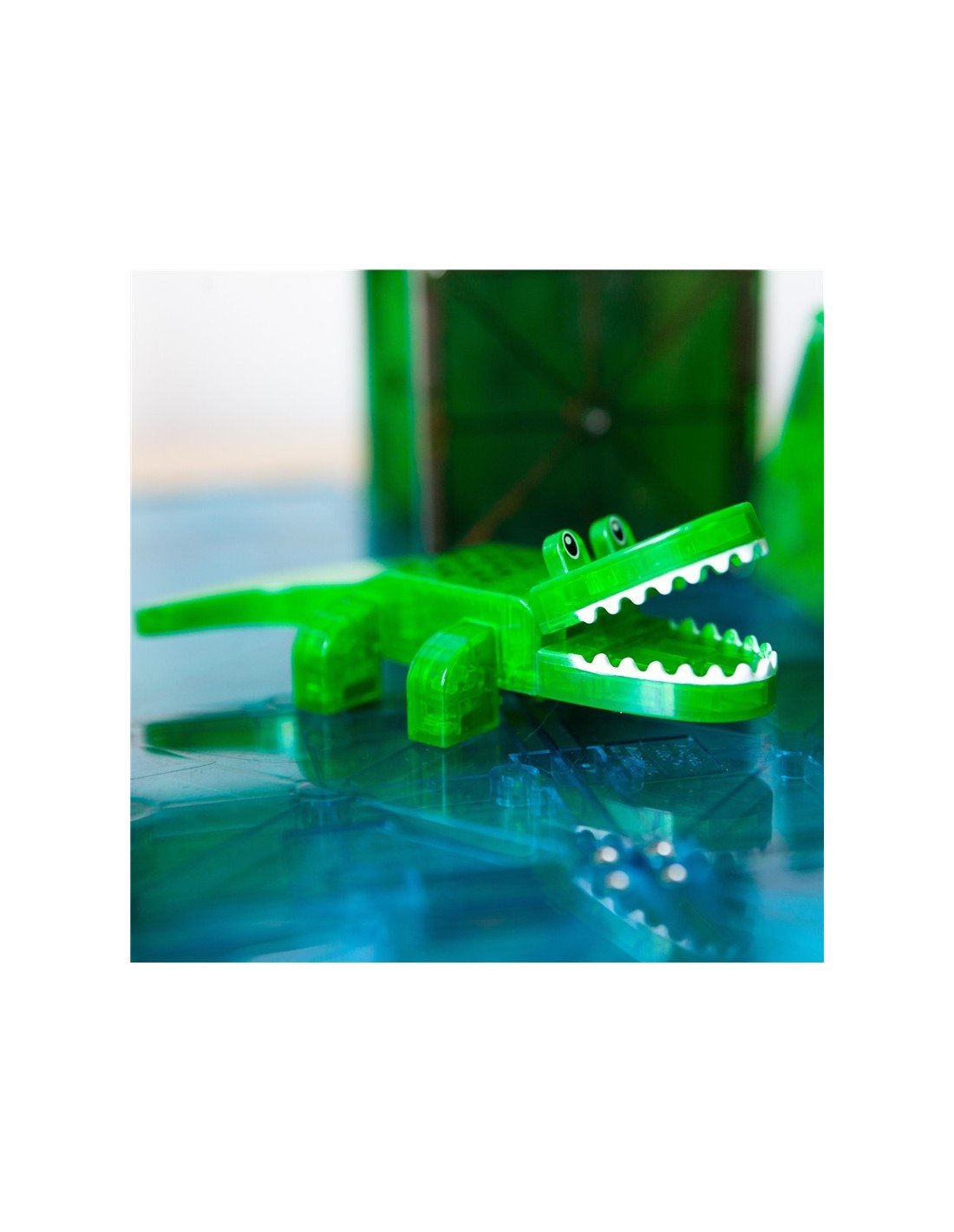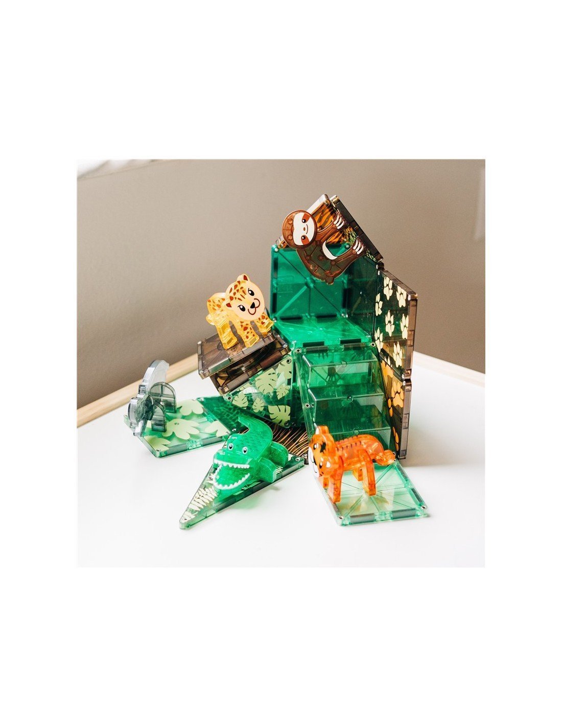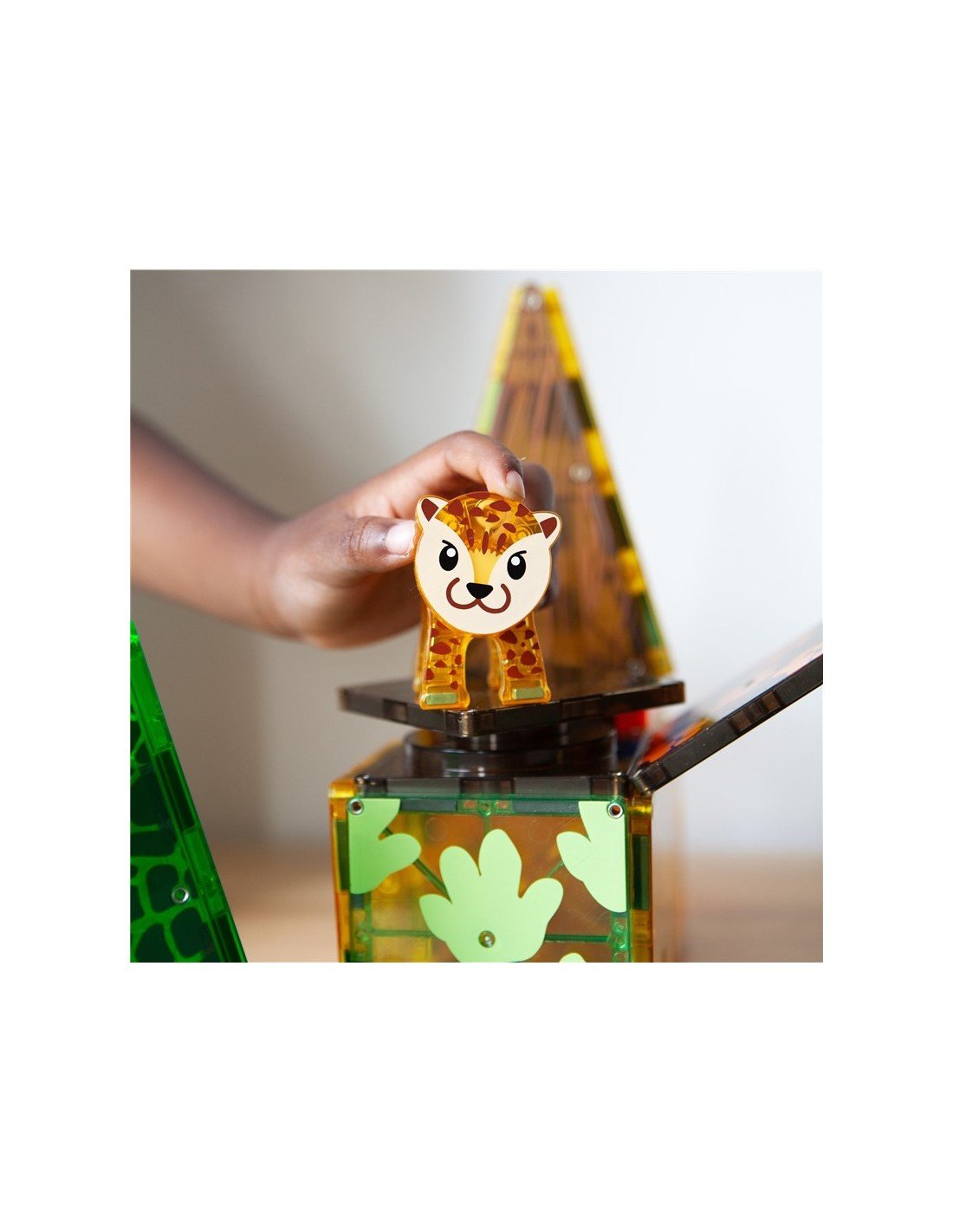 Desde la construcción de nuevos entornos hasta la creación de emocionantes aventuras con animales, los jóvenes amantes de los animales pueden encontrar infinitas oportunidades para explorar sin salir de la sala de juegos. Usando las piezas magnéticas Magna-Tiles® que reflejan la vibrante vegetación y la vida silvestre única del bosque tropical, los niños podrán rugir de emoción mientras aprenden sobre las criaturas a través del juego interactivo.