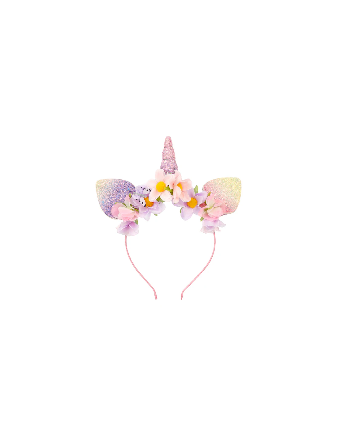 Esta diadema rosa y lila con decoración de flores y mariposas, con orejitas de unicornio es ideal para complementar disfraz de unicornio!