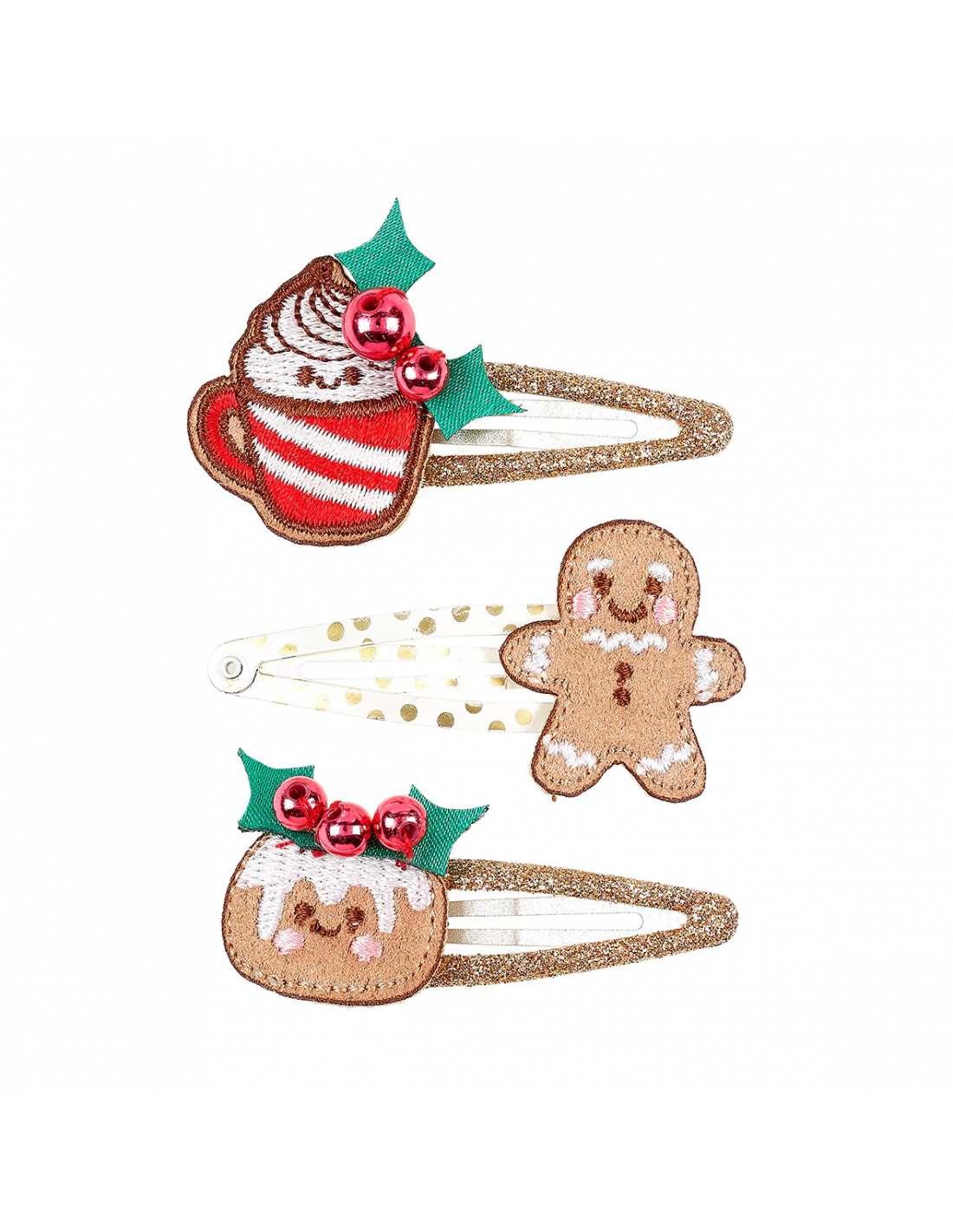 Dale un toque navideño a tu peinado con estas encantadoras pinzas para el cabello Curille. Cada pinza de 5 cm presenta encantadores diseños navideños: un reconfortante chocolate caliente, un hombre de jengibre y una bebida navideña espumosa, en cálidos tonos marrón, blanco, rojo y verde. Perfectas para celebrar la temporada con detalles sutiles y elegantes que iluminan cualquier look. Este juego de tres pinzas viene en una tarjeta, lo que las convierte en el regalo ideal o un capricho navideño.