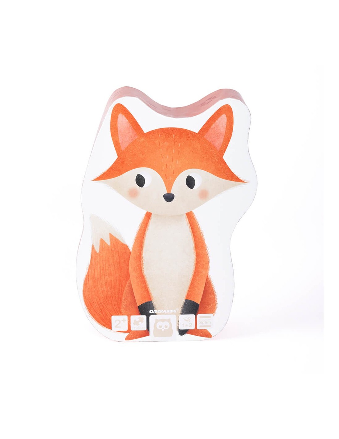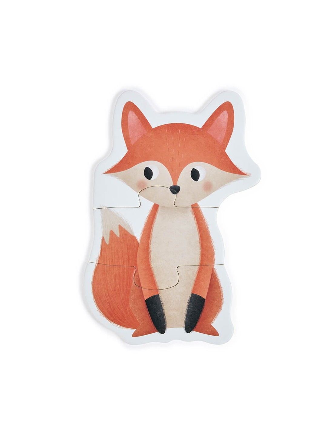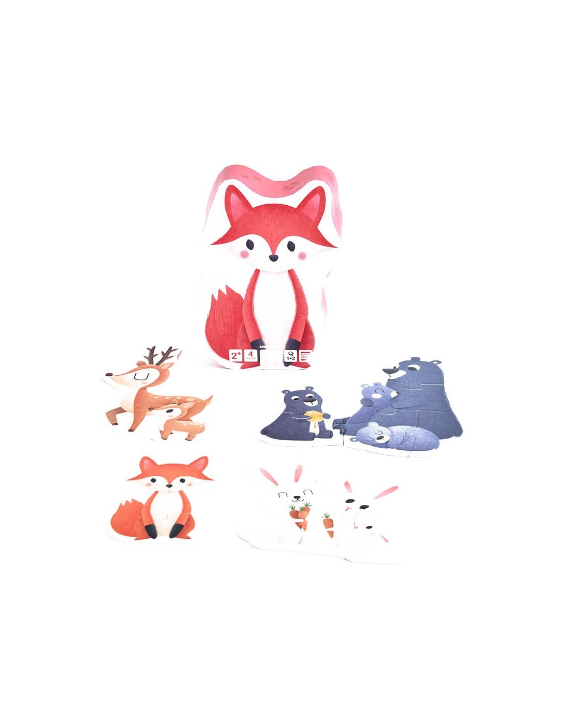 Contiene 4 puzles distintos con forma de animales del bosque: 1 zorro, 3 conejitos, 2 renos y 4 osos.