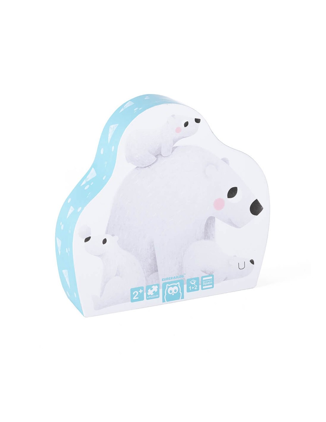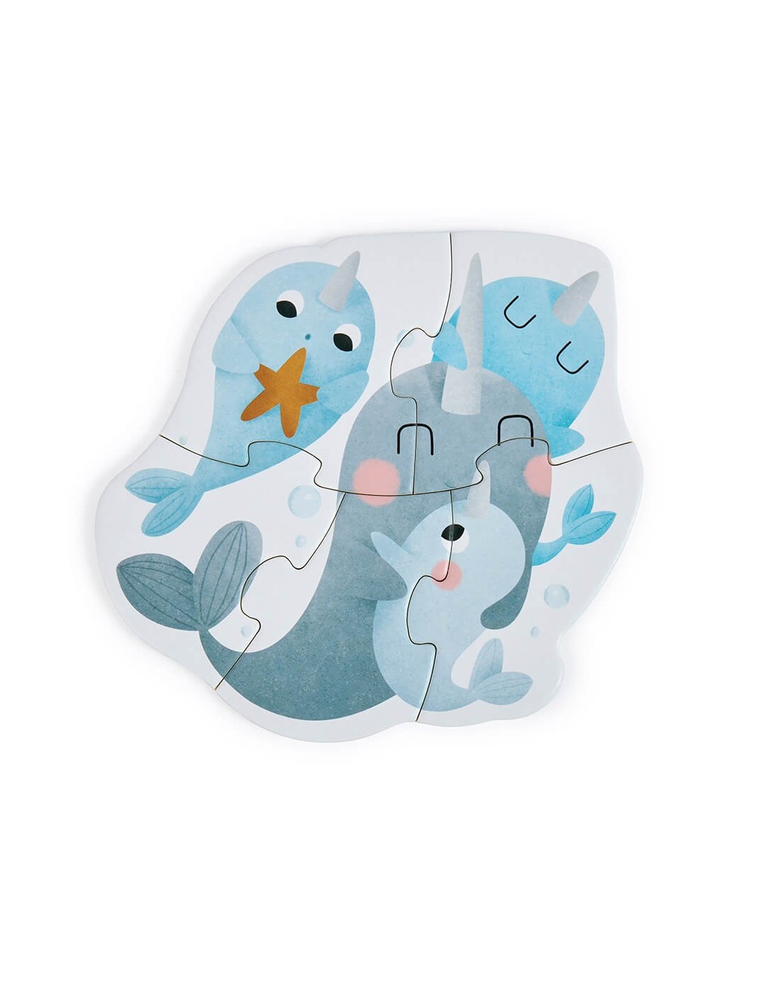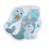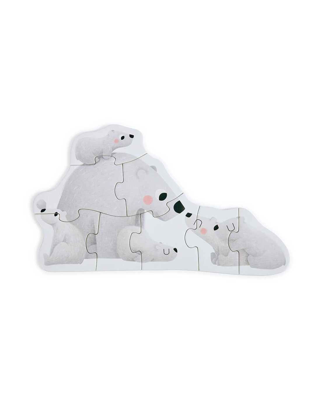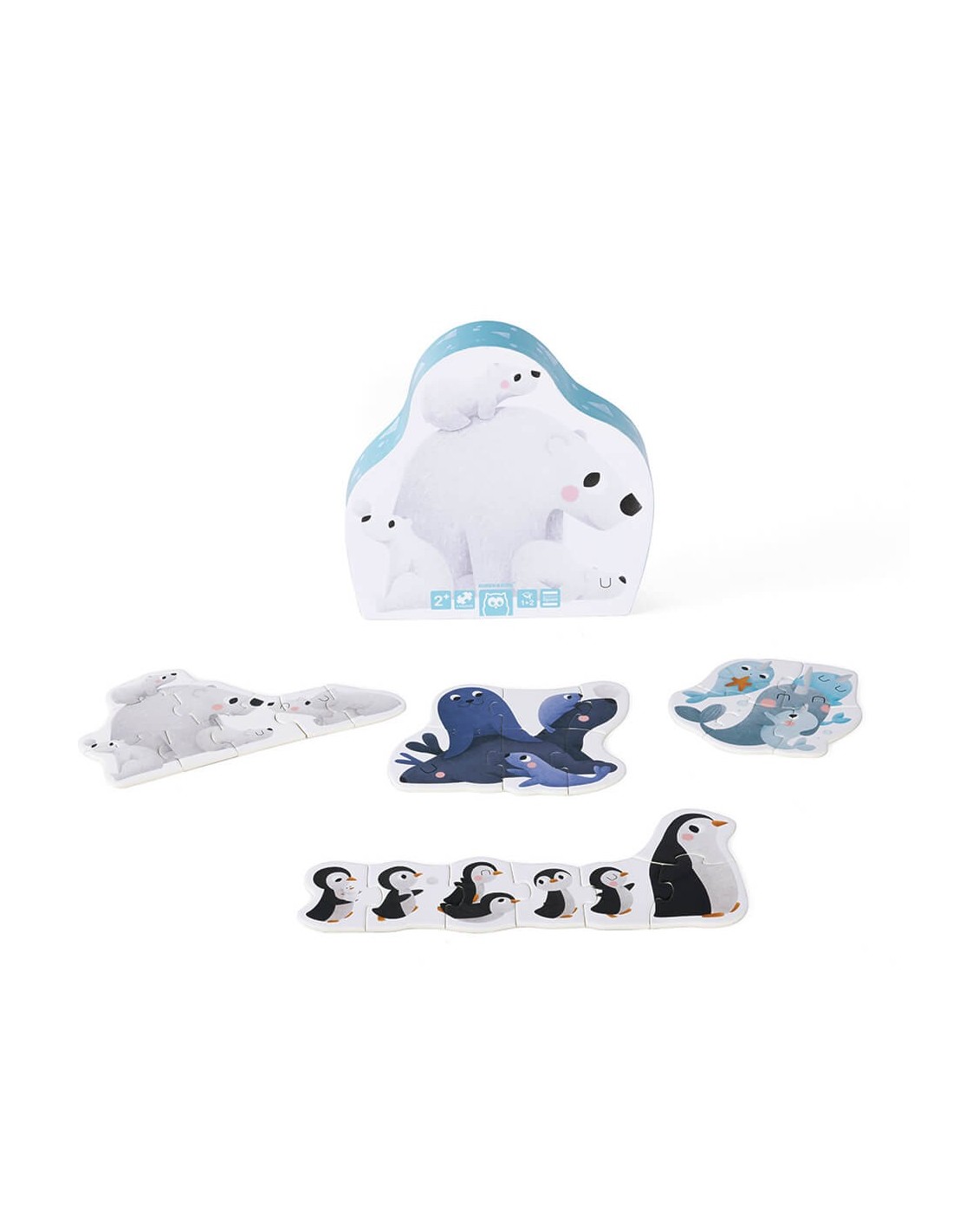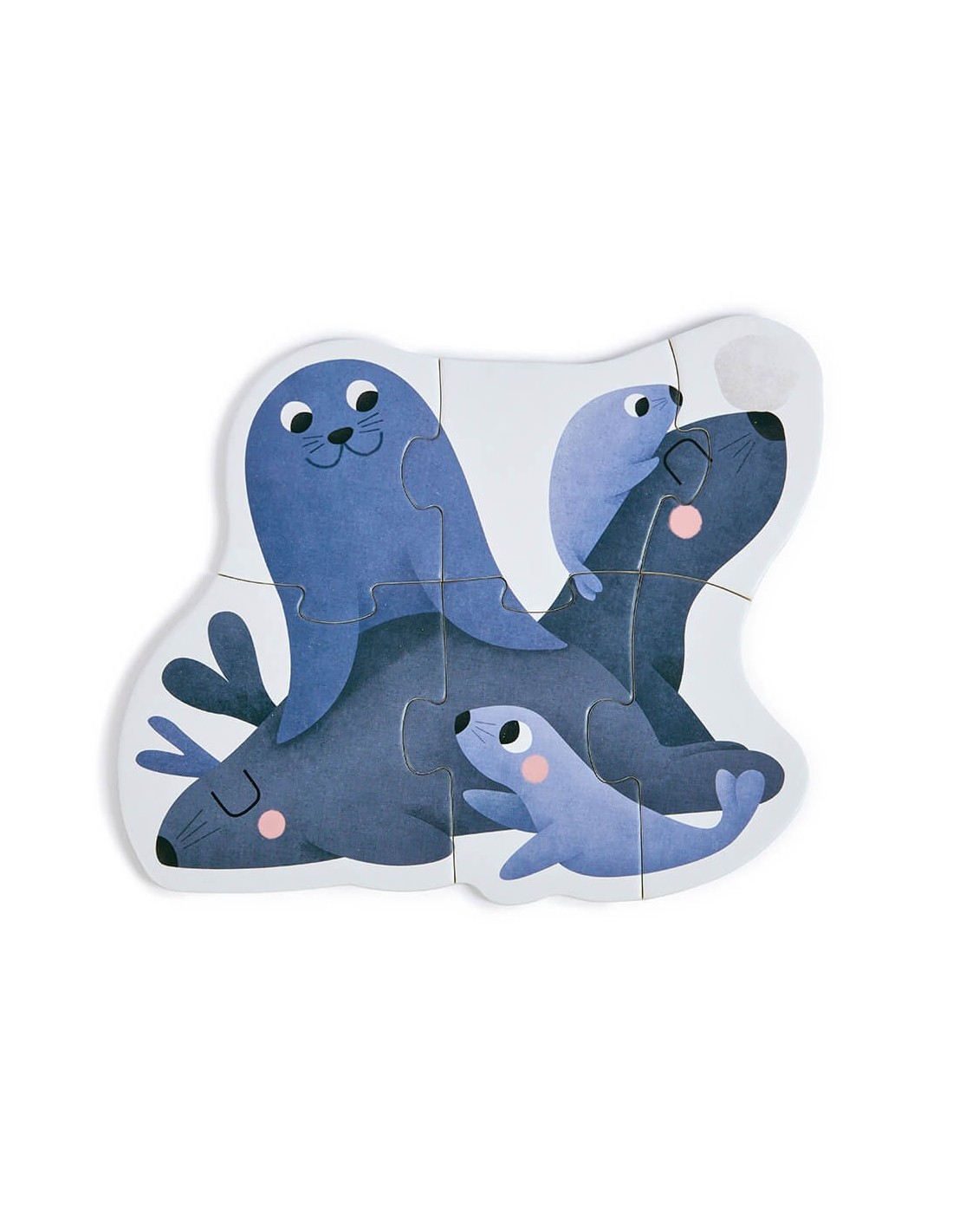 Contiene 4 puzles distintos con forma de animales del bosque: 4 delfines, 5 focas, 6 osos polares y 7 pingüinos.