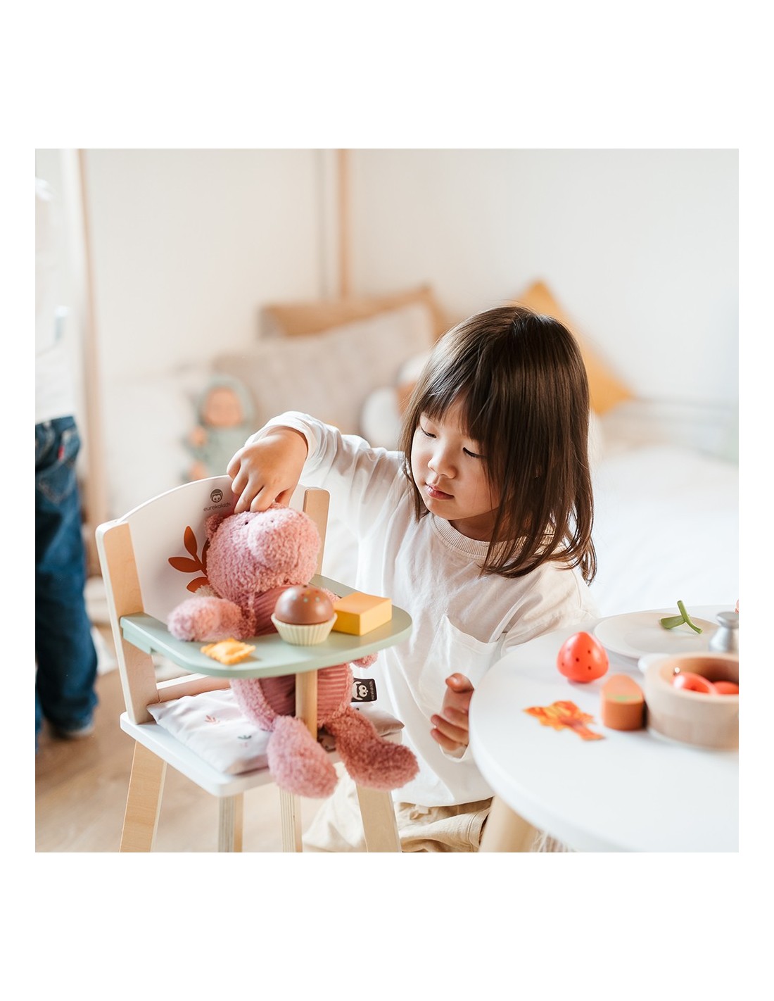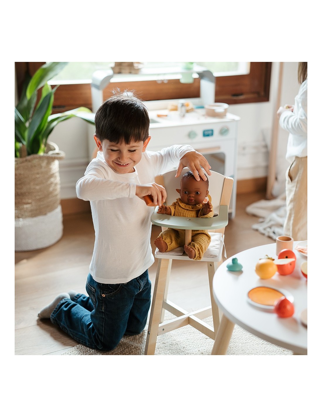 Esta trona para muñecas es justo lo que necesitan los peques para hacerlas sentar a comer y tratarlas como a sus propios bebés. Es ideal para promover el juego simbólico; preparando la comida, sentando la muñeca en la trona y, ¡comiendo junt@s!