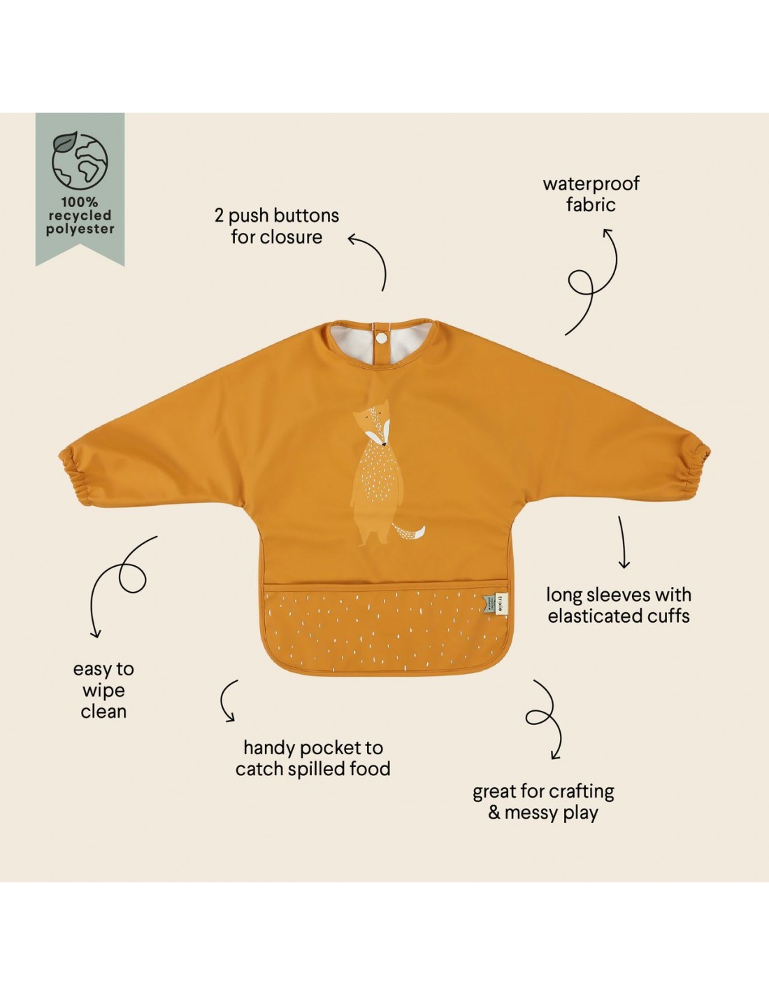 ¡Qué bien lo pasamos en la mesa con tu animal favorito! Este alegre babero viene con unas prácticas mangas largas y mantiene limpia la ropa del bebé mientras disfruta de una rica comida, bebida o merienda. El práctico bolsillo asegura que todo lo que se caiga quede bien recogido, evitando los grandes desastres. Más buenas noticias: ¡el tejido está hecho de poliéster 100 % reciclado y es impermeable! Es fácil de limpiar y ahorra mucho tiempo de lavado o limpieza.