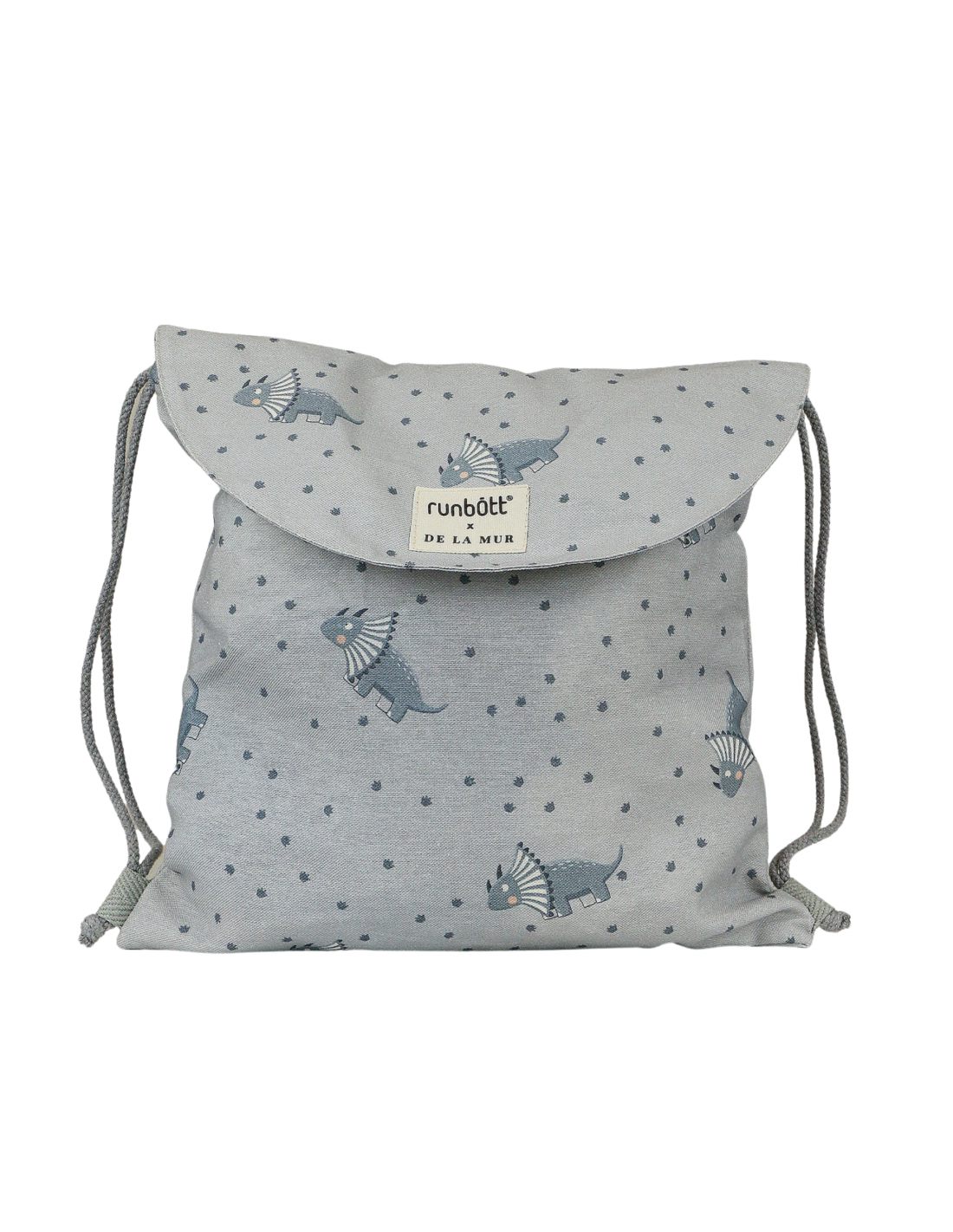 Mochila saco en tejido half-panamá (80 % algodón, 20 % poliéster) en colaboración con De La Mur, con estampado infantil de Marta Munté. Cierre de solapa con velcro y cuerdas como asas para colgar a la espalda.