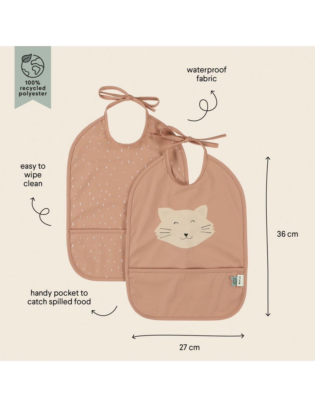¡Qué bien lo pasamos en la mesa con tu animal favorito! Este divertido juego de 2 baberos mantiene limpia la ropa del peque mientras disfruta de una rica comida, bebida o tentempié. El práctico bolsillo asegura que todo lo que se caiga quede bien recogido, evitando los grandes desastres. Viene con unos prácticos cordones de cierre que hacen se pueda ajustar a medida que el niño crece. Más buenas noticias: ¡el tejido está hecho de poliéster 100 % reciclado y es impermeable! Es fácil de limpiar y ahorra mucho tiempo de lavado o limpieza. , recubrimiento revestimiento de poliuretano