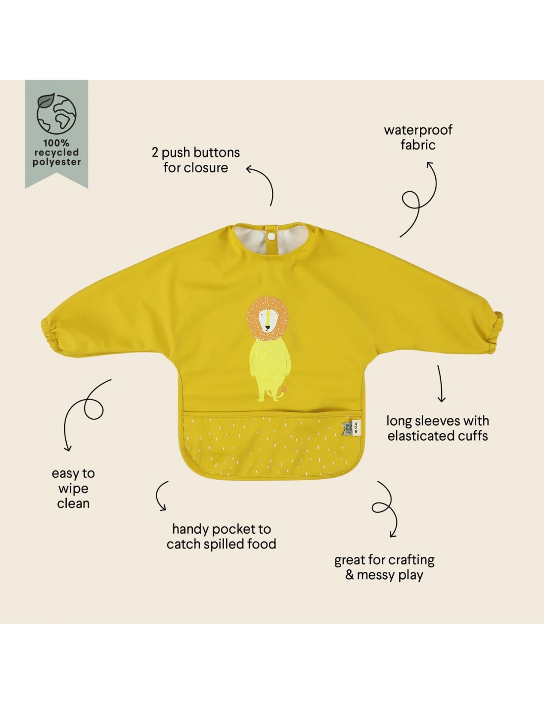¡Qué bien lo pasamos en la mesa con tu animal favorito! Este alegre babero viene con unas prácticas mangas largas y mantiene limpia la ropa del bebé mientras disfruta de una rica comida, bebida o merienda. El práctico bolsillo asegura que todo lo que se caiga quede bien recogido, evitando los grandes desastres. Más buenas noticias: ¡el tejido está hecho de poliéster 100 % reciclado y es impermeable! Es fácil de limpiar y ahorra mucho tiempo de lavado o limpieza.