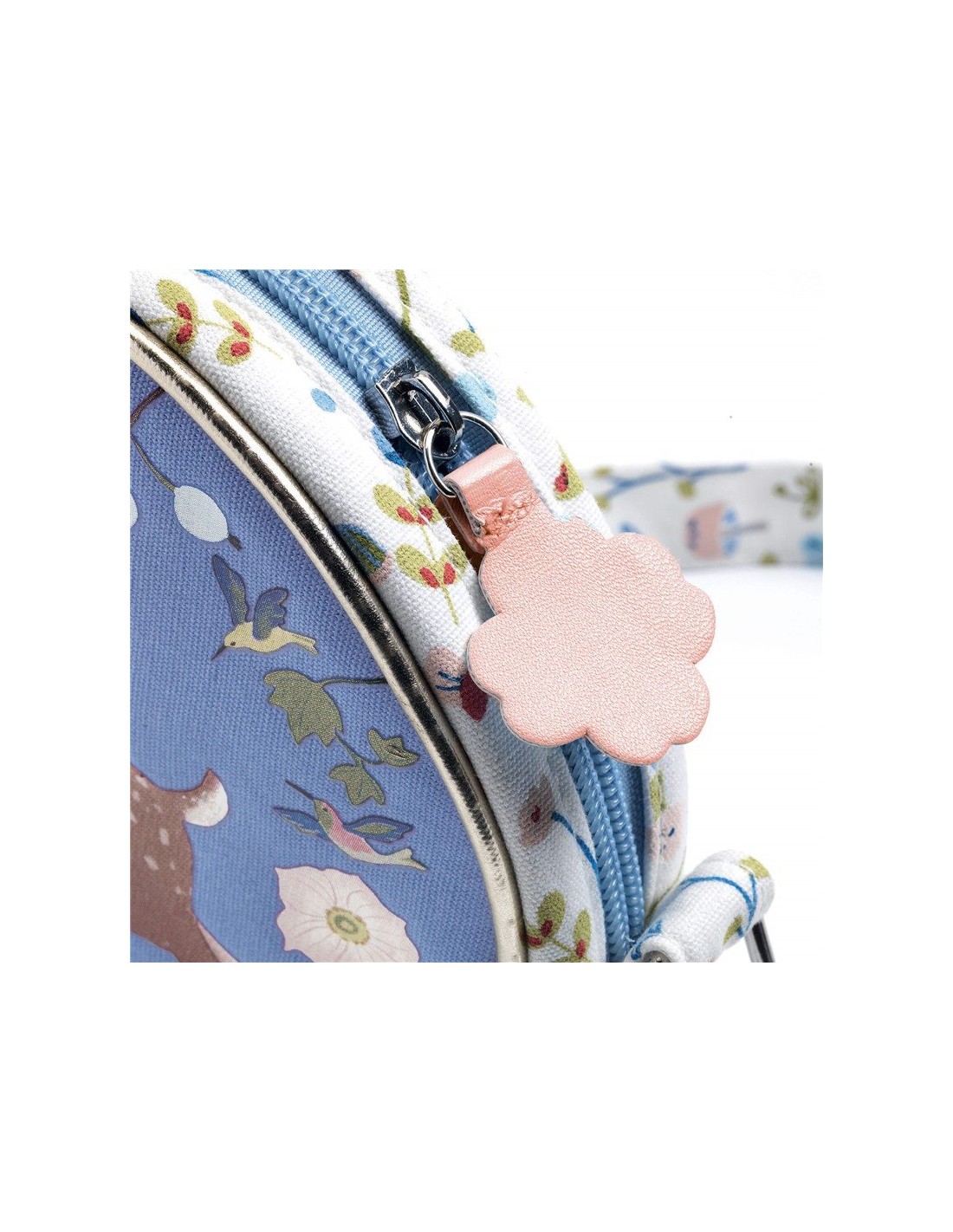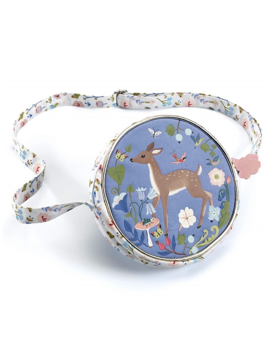 Con una ilustración suave y llena de detalles inspirados en la naturaleza, este bolso destaca por su formato redondo y su tamaño perfecto para llevar pequeños imprescindibles. Su correa ajustable permite adaptarlo cómodamente, favoreciendo la autonomía y el juego simbólico.