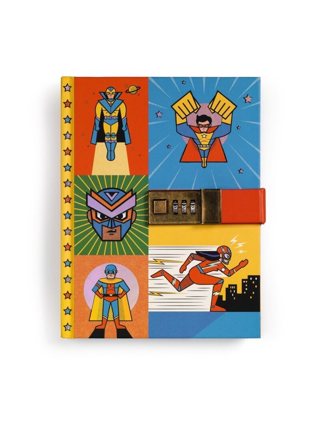 Con un diseño lleno de acción inspirado en superhéroes, este cuaderno invita a escribir, dibujar y dejar volar la imaginación mientras mantiene todo a salvo gracias a su cierre con candado y combinación.