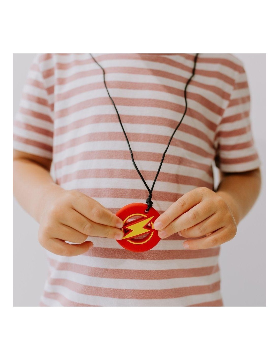 Recomendado por terapeutas ocupacionales, este colgante puede utilizarse como apoyo sensorial para que el niño disponga de una herramienta accesible, cómoda y discreta. Es una herramienta de autorregulación sensorial pensada para niños a partir de 3 años. Su diseño llamativo y fácil de manipular lo convierte en un recurso práctico para acompañar momentos de nerviosismo, frustración o emociones intensas, ofreciendo una vía segura y funcional para la estimulación oral.