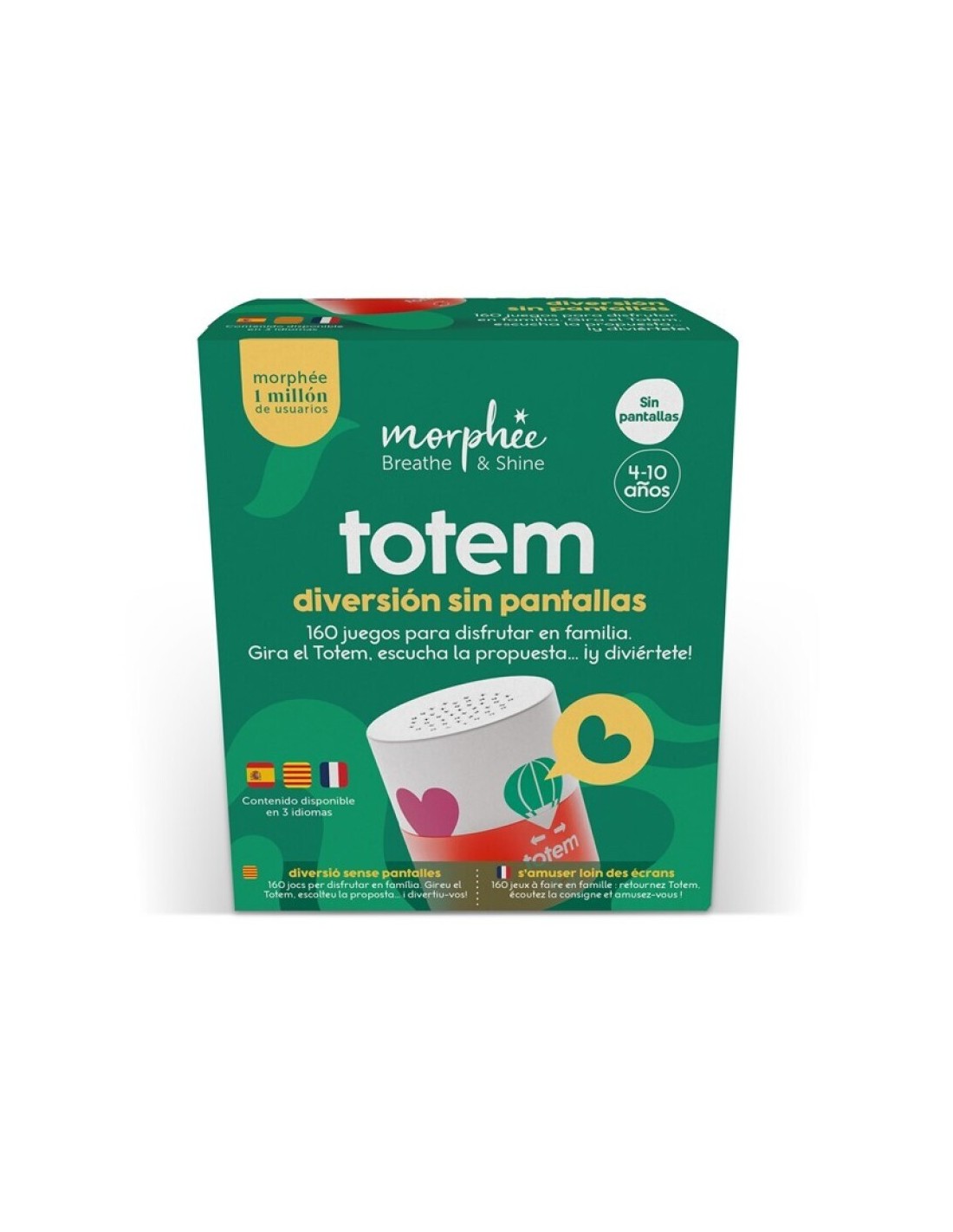 TOTEM es la caja de juegos de audio de Morphée pensada para divertirse en familia lejos de las pantallas. Incluye 160 juegos y actividades guiadas por audio, ideales para compartir momentos de risas, complicidad y conexión… ¡sin necesidad de móvil, app ni materiales!