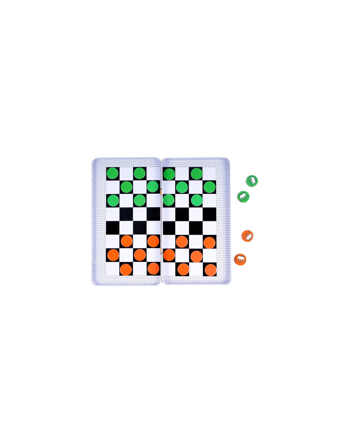 Clásico juego de las damas, ahora en un formato especial en caja de lata, ideal para llevar a cualquier parte y jugar mientras estamos de viaje en el coche. El objetivo de este juego es lograr ser el jugador con fichas activas en el tablero al final de la partida. Cada jugador dispone de 12 fichas que dispone de forma alterna en las casillas de extremos opuestos del tablero. Por turnos se hace avanzar fichas hacia delante y en diagonal, intentando comer fichas del contrincante o llegar al otro extremo del tablero. Un divertido juego para dos jugadores con el que trabajar la observación, la atención y el razonamiento lógico, al tiempo que permite divertirse en los trayectos por carretera. La caja sirve de tablero de juego y las instrucciones están impresas en la misma.