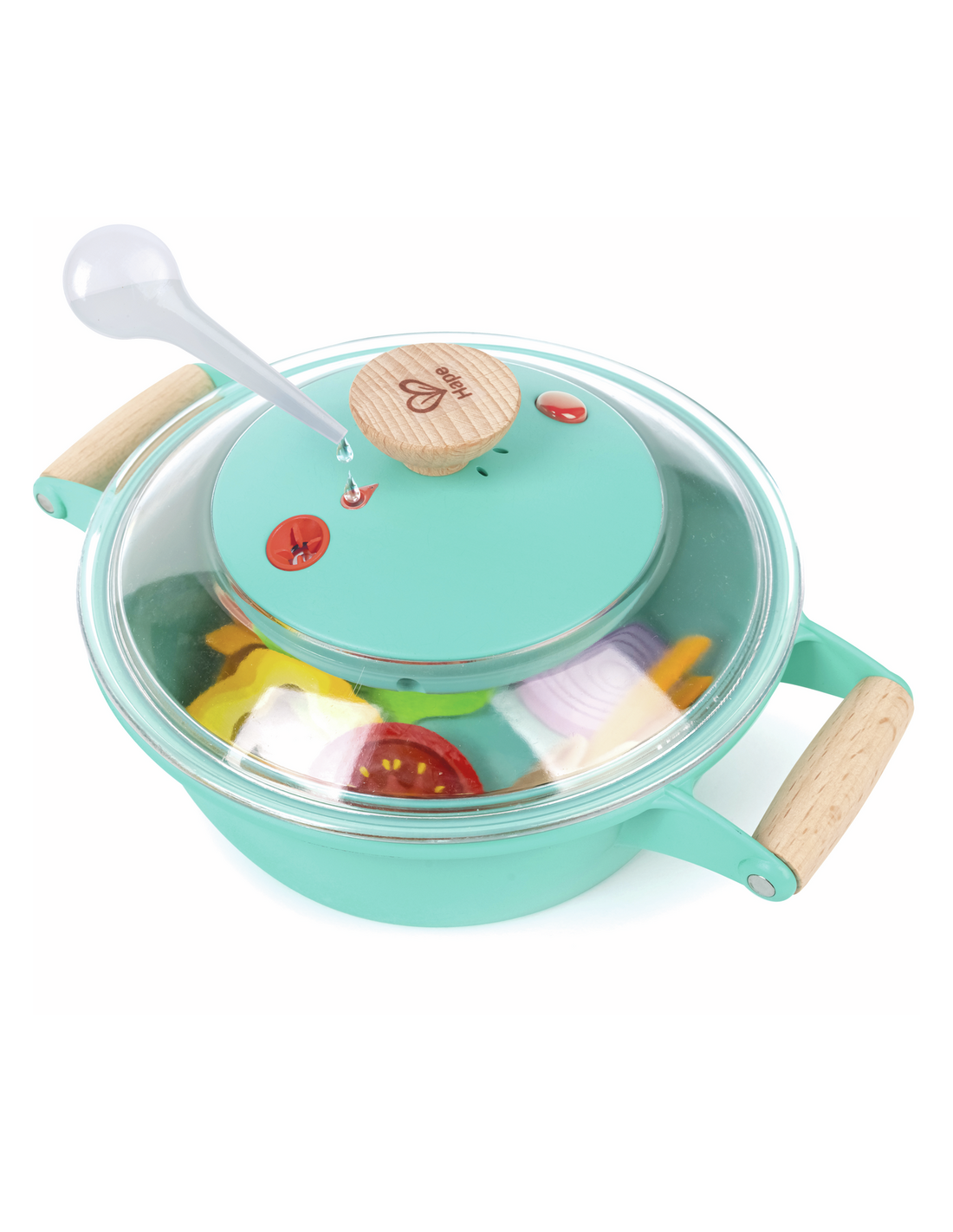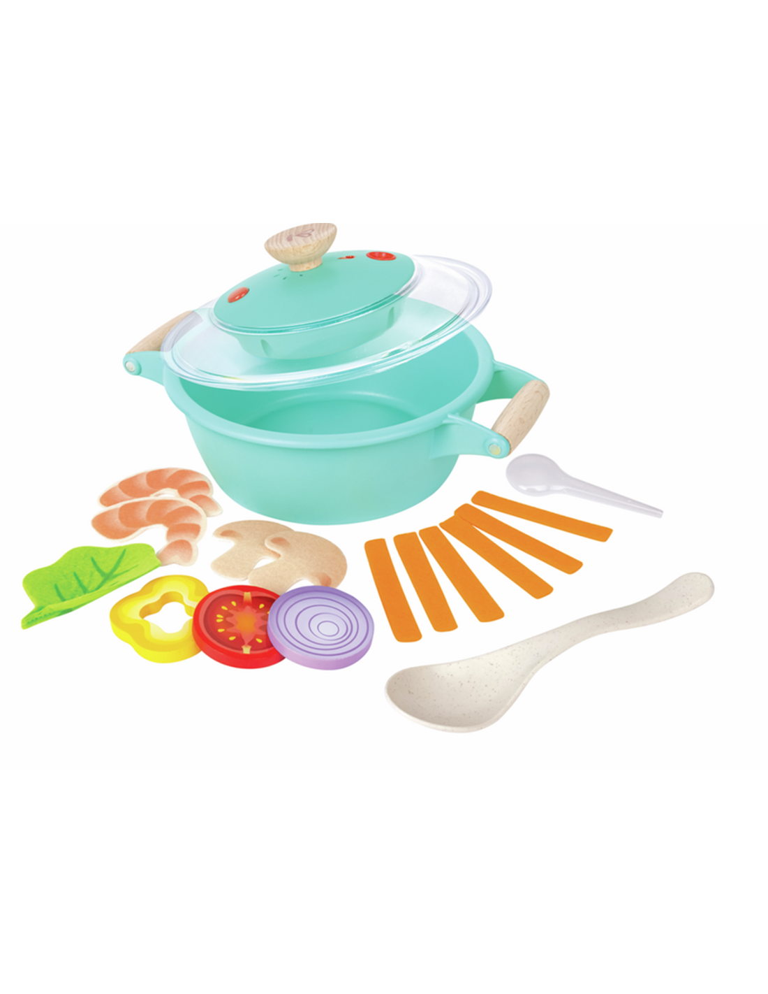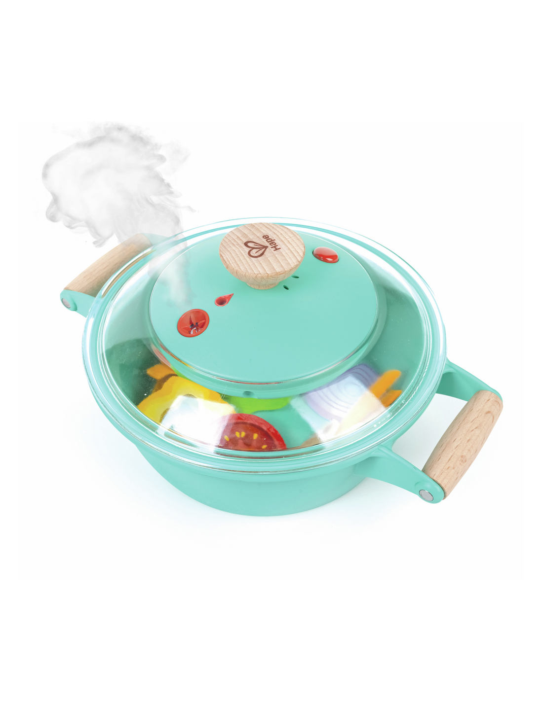 Olla de vapor moderna e interactiva con 14 piezas de comida para jugar.
