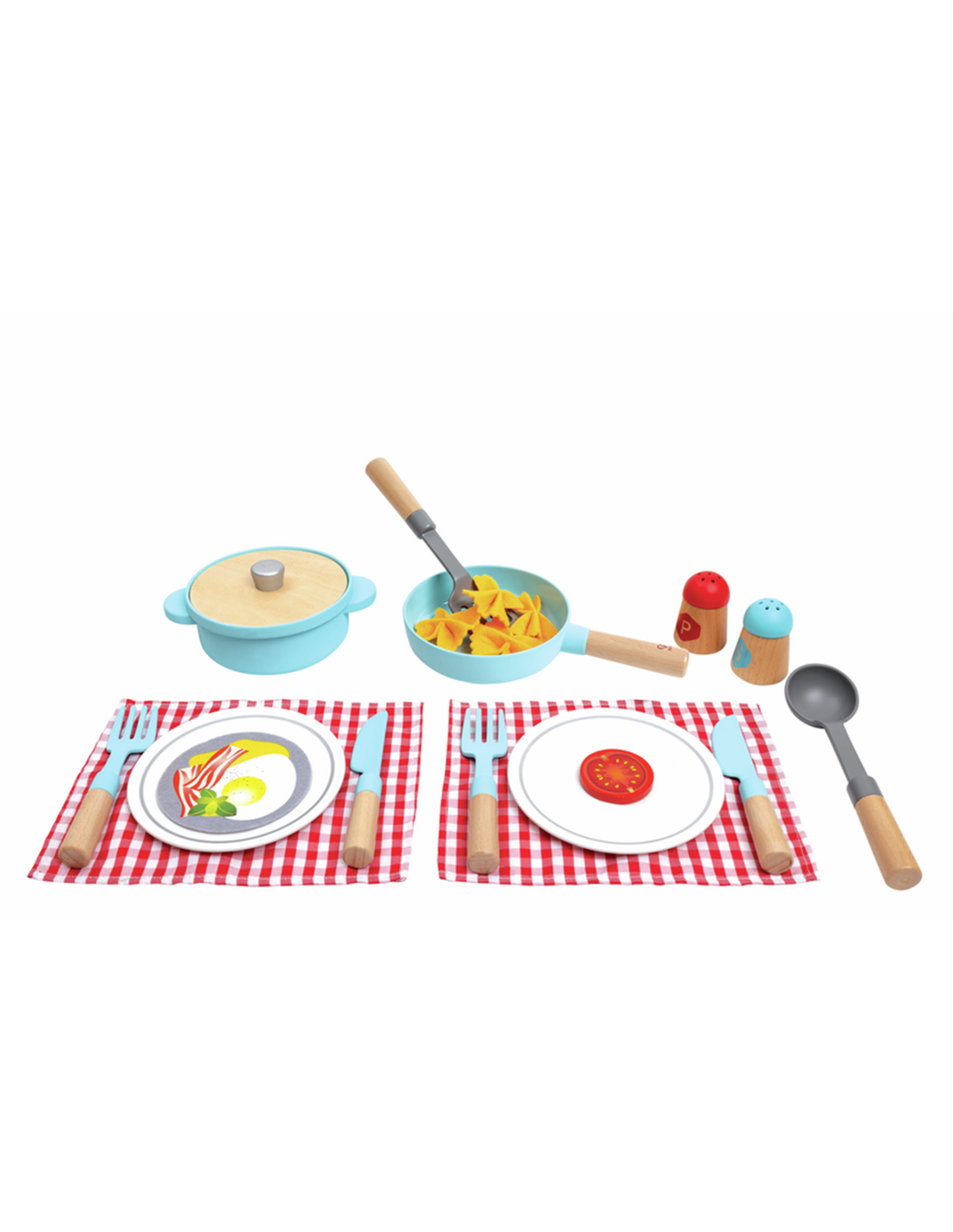 Con la olla de madera, la sartén de madera, los platos de madera y los accesorios del juego para cocinar y servir, tu hijo tendrá todo lo que necesita para preparar una deliciosa comida para sus amigos o familiares.