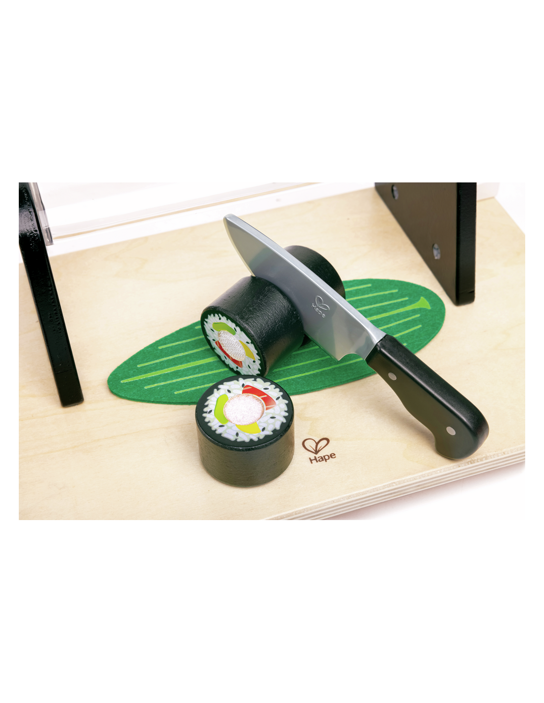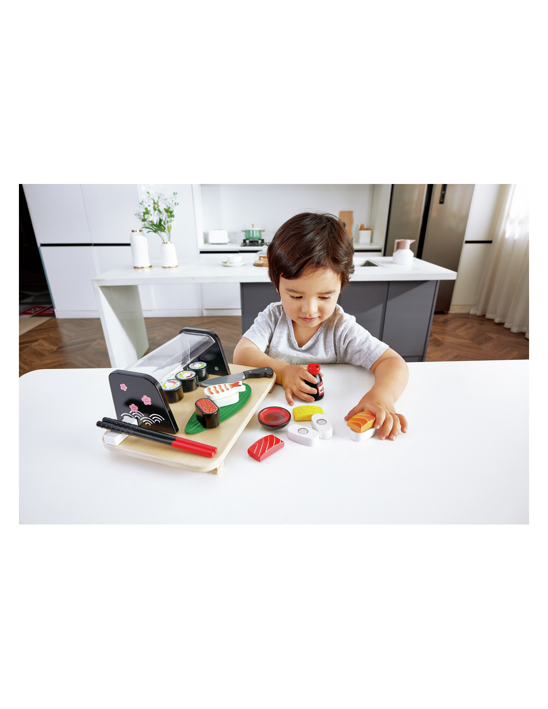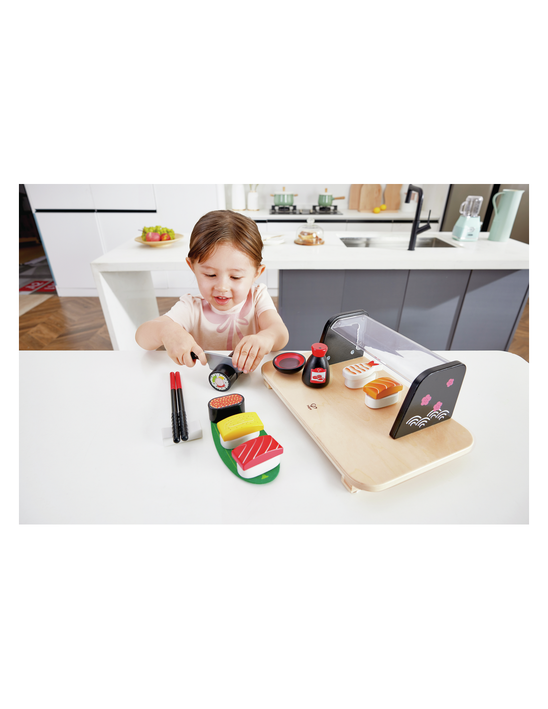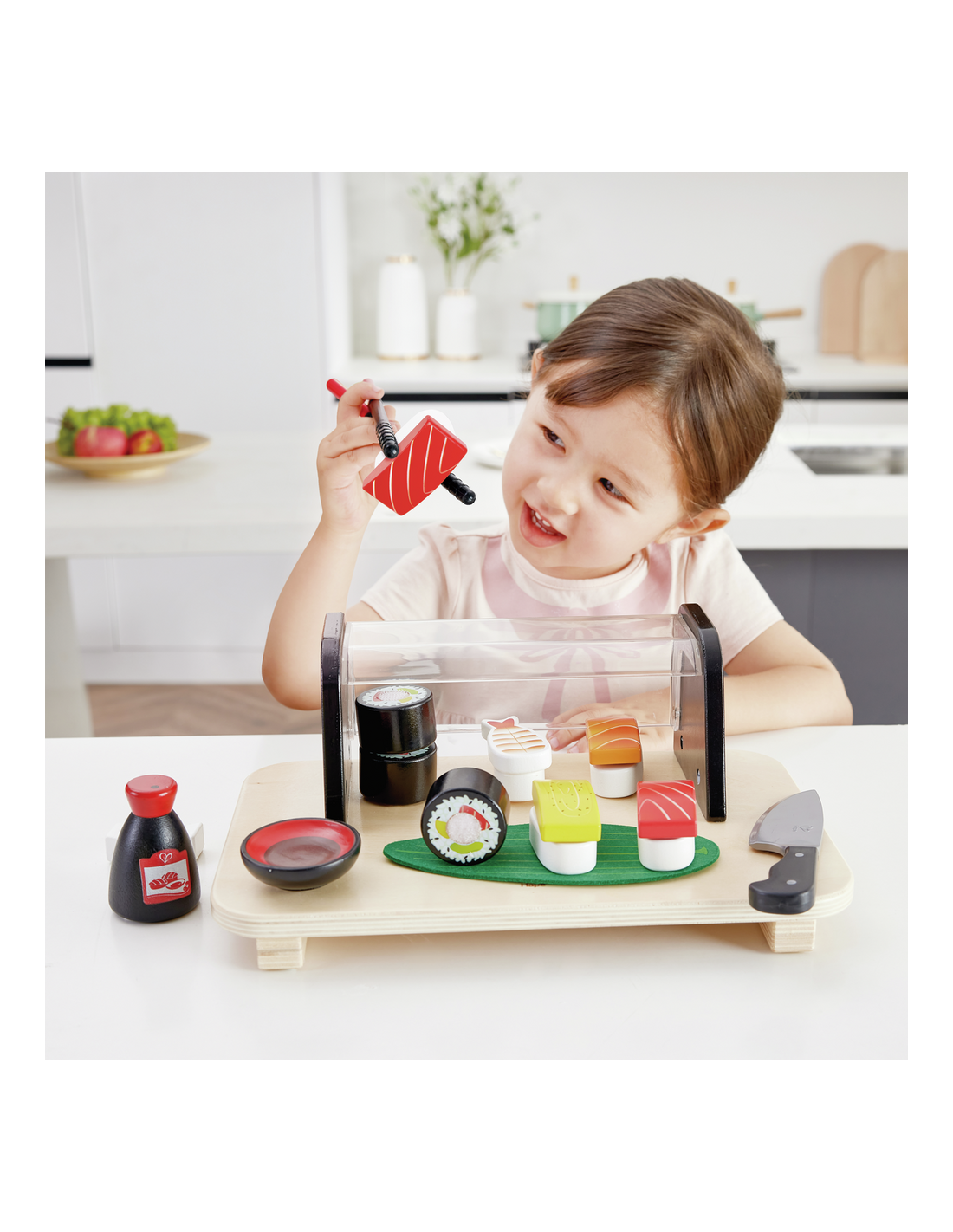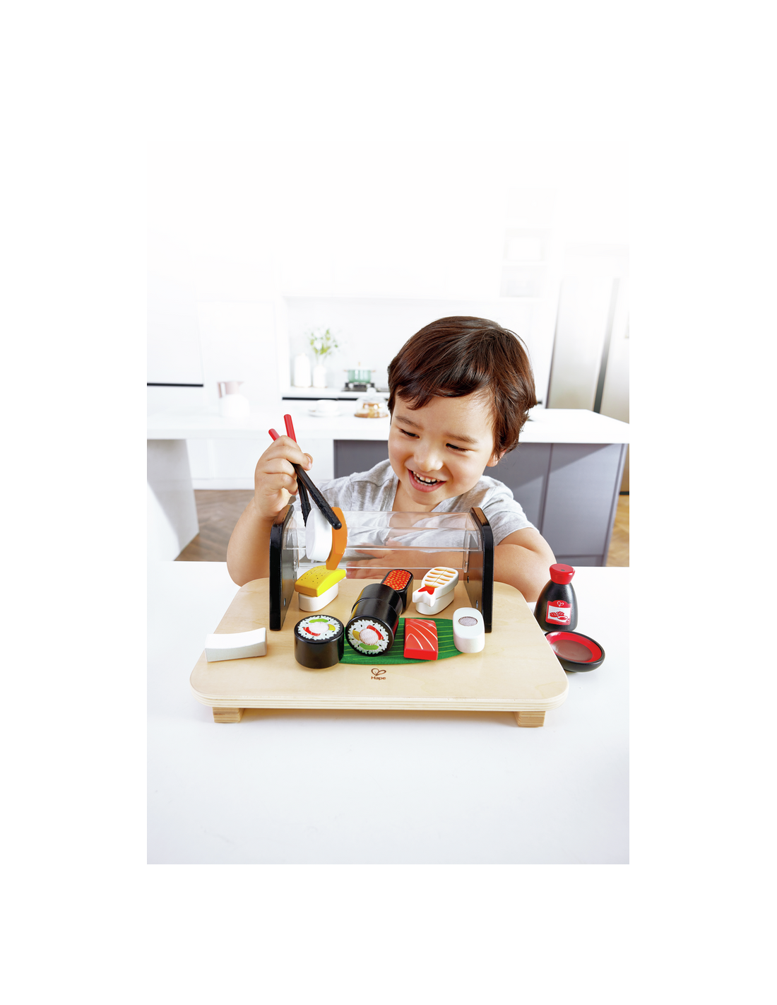 ¡Dale a tus familiares y amigos el sabor de Japón con este maravilloso set de sushi! ¡Corta, condimenta y prepara con cuidado tu rollo de sushi y algas en tu bandeja y muéstralos para tu familia y amigos en el genial escaparate! ¡Agregue salsa de soja y wasabi para darle sabor! Incluye una bandeja, un escaparate, un platillo con wasabi de juego, una botella de salsa de soja de juego, un par de palillos, un cuchillo de juego, seis piezas de sushi y un rollo de algas. Perfecto para desarrollar el lenguaje y las habilidades sociales, así como para promover la imaginación.