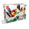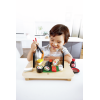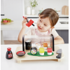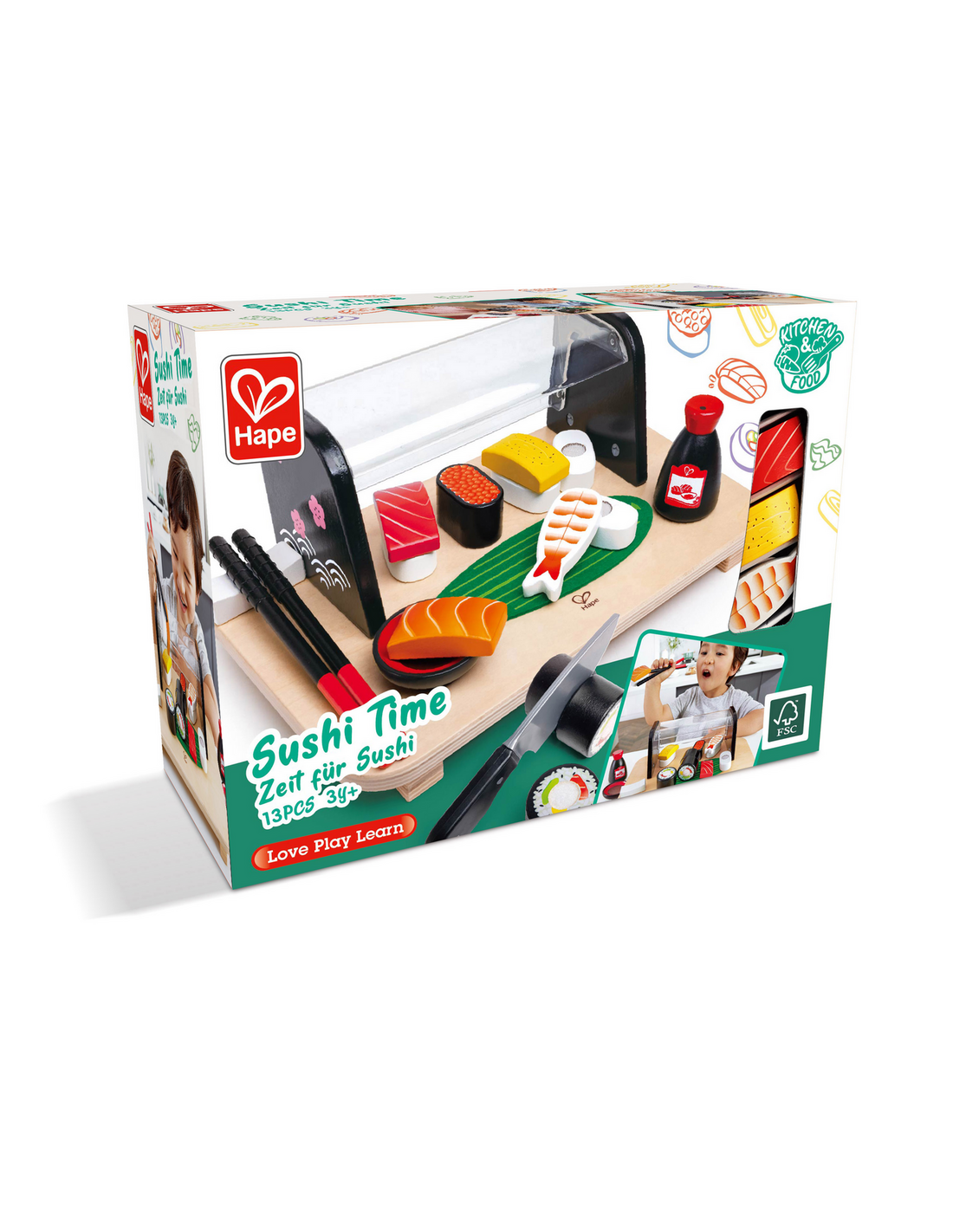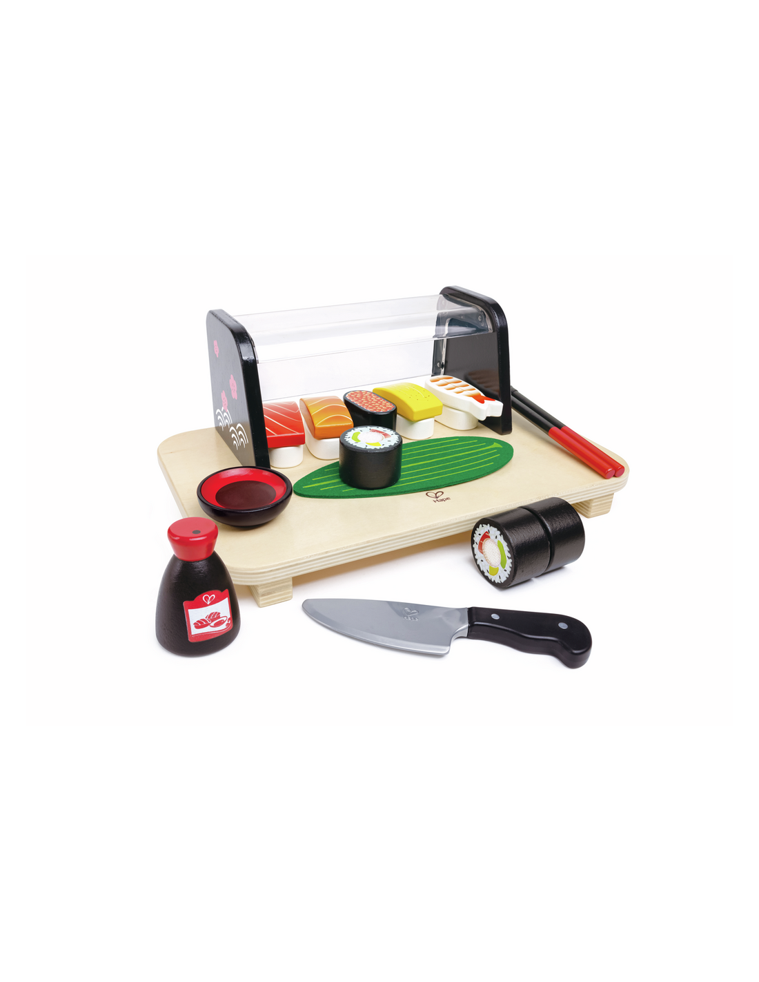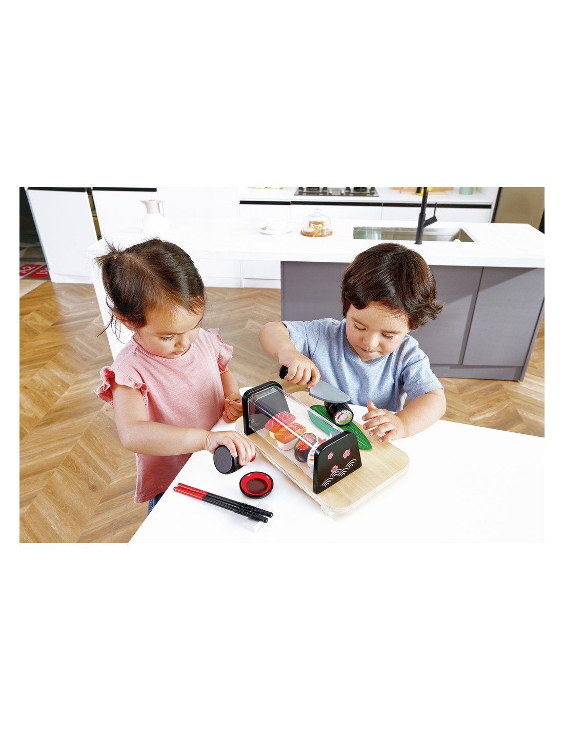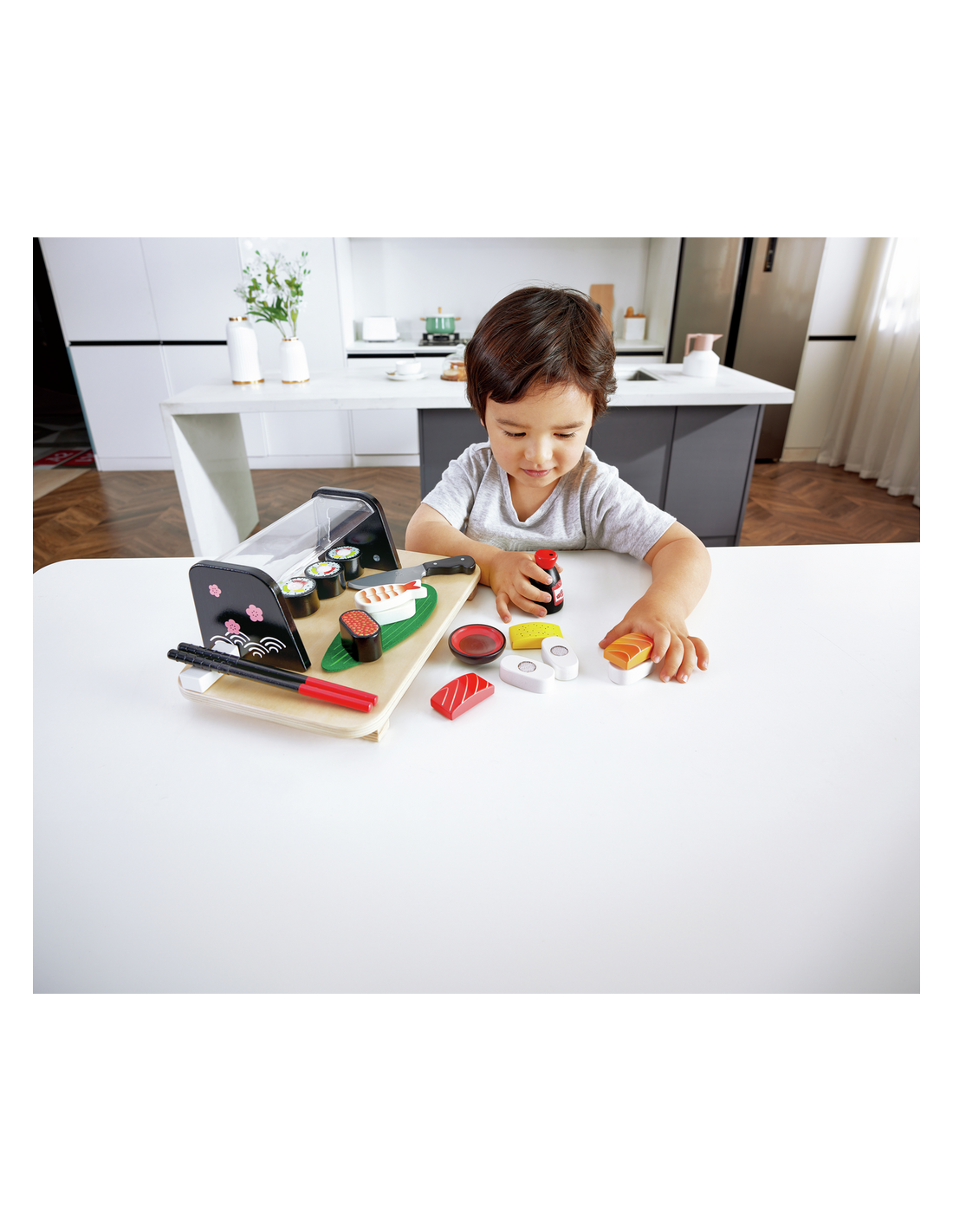 ¡Dale a tus familiares y amigos el sabor de Japón con este maravilloso set de sushi! ¡Corta, condimenta y prepara con cuidado tu rollo de sushi y algas en tu bandeja y muéstralos para tu familia y amigos en el genial escaparate! ¡Agregue salsa de soja y wasabi para darle sabor! Incluye una bandeja, un escaparate, un platillo con wasabi de juego, una botella de salsa de soja de juego, un par de palillos, un cuchillo de juego, seis piezas de sushi y un rollo de algas. Perfecto para desarrollar el lenguaje y las habilidades sociales, así como para promover la imaginación.