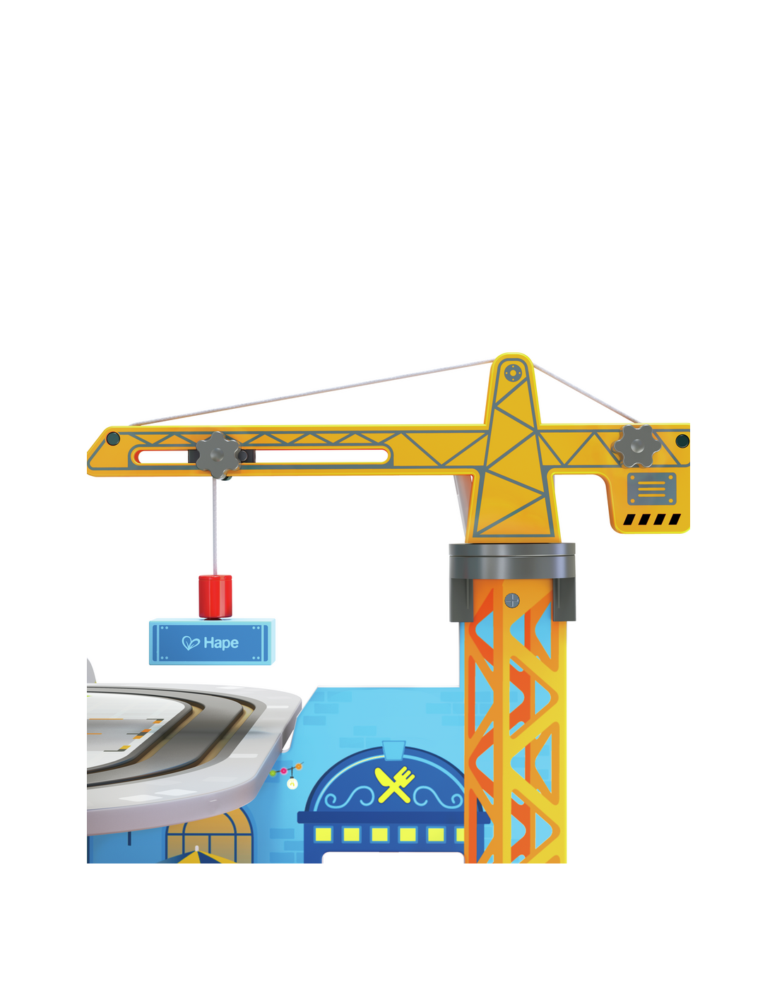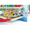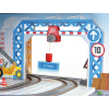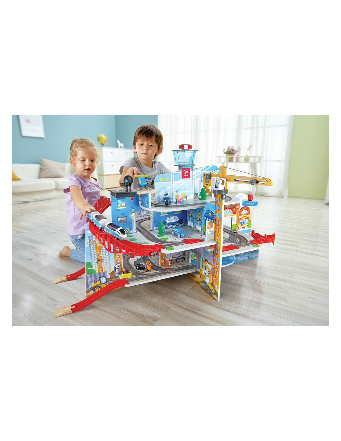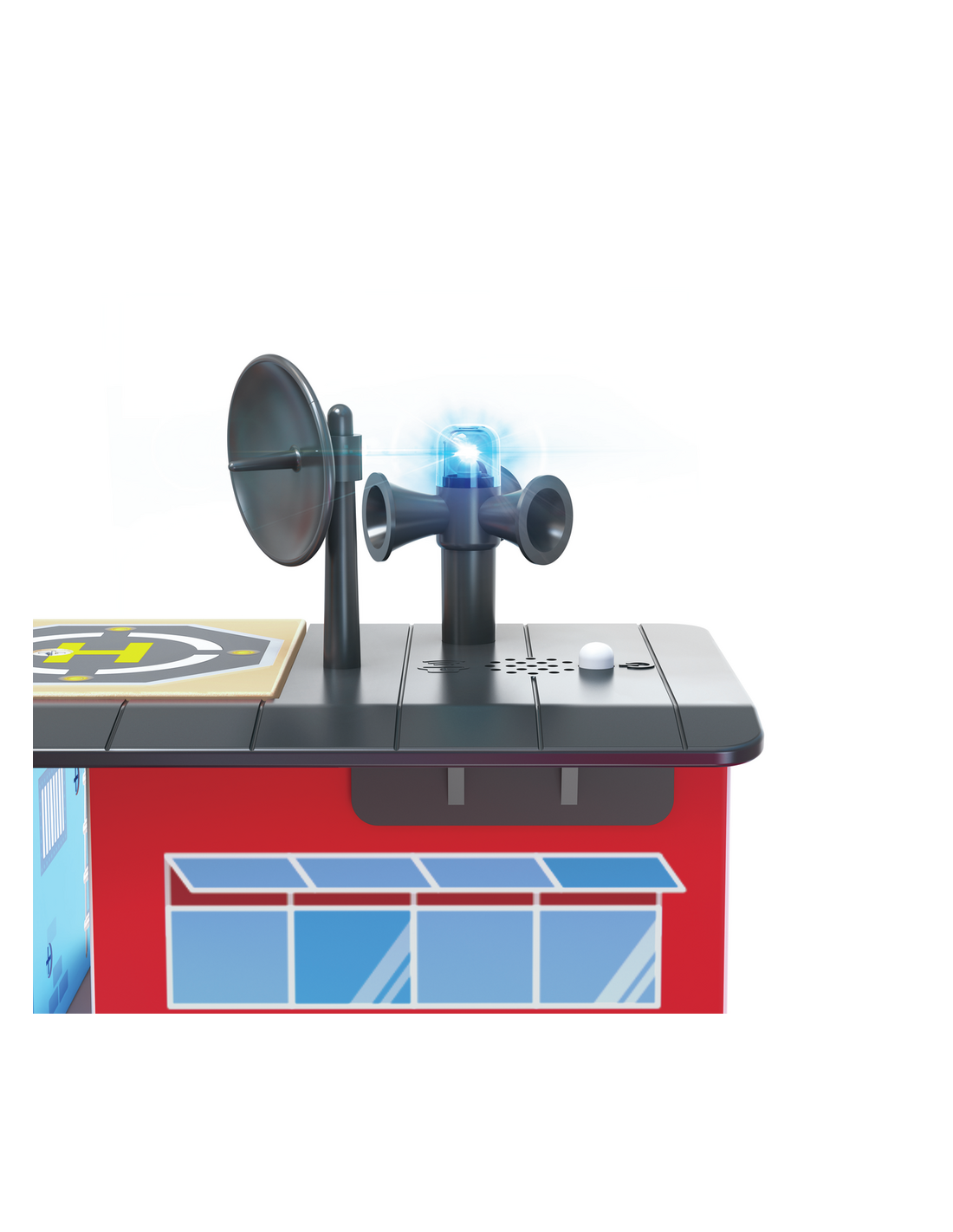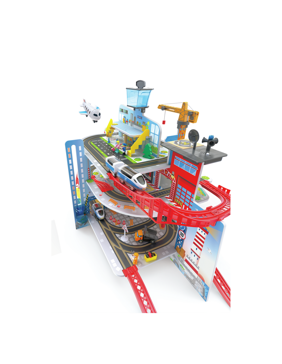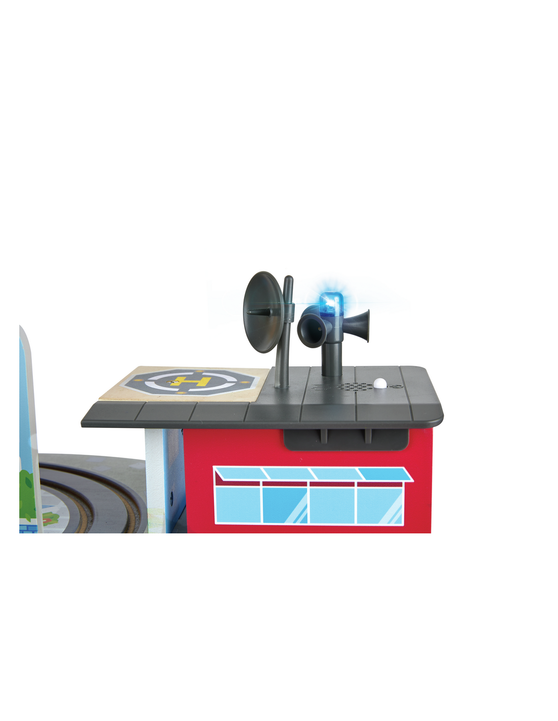 E l área de juego incluye: una torre de vigilancia, una comisaría de policía, escaleras, un ascensor, un avión, un tren, un camión de bomberos, un camión con un bloque de carga, un disco giratorio, una grúa y figuras, vías de tren y tramos de carrete.