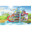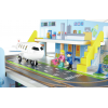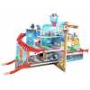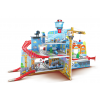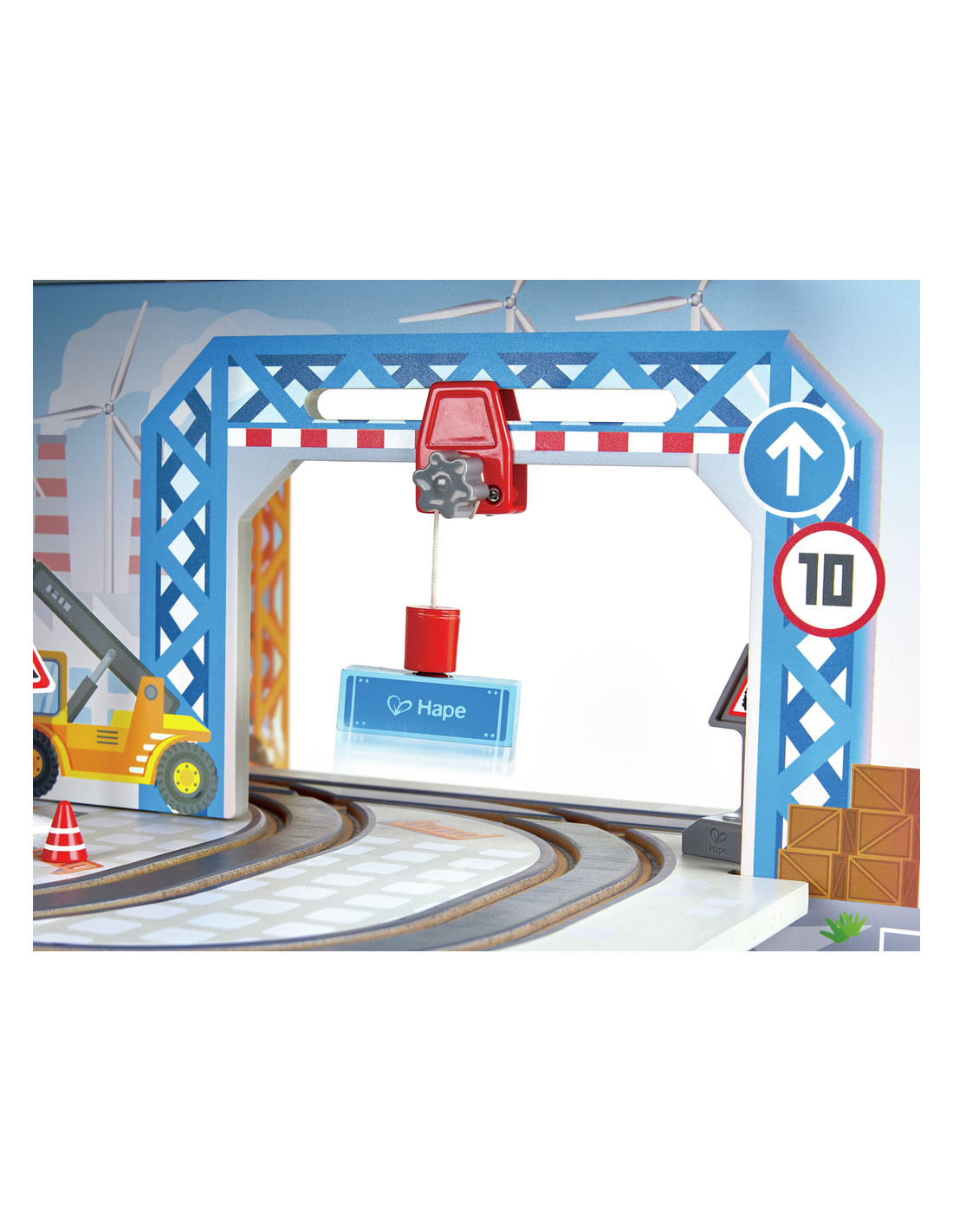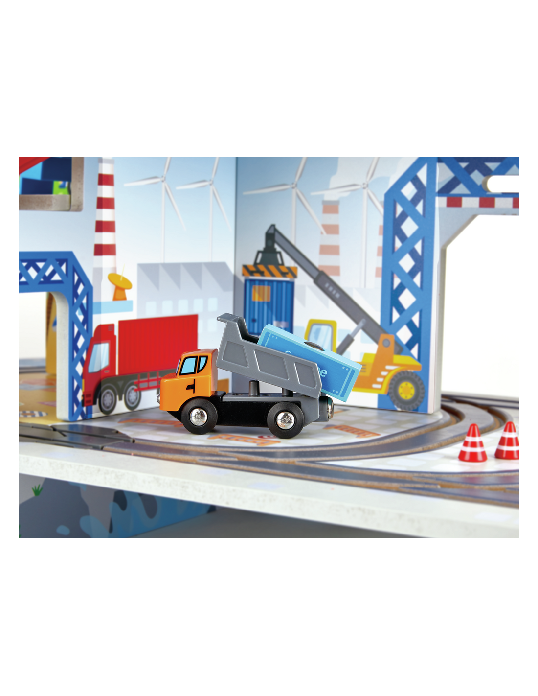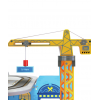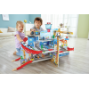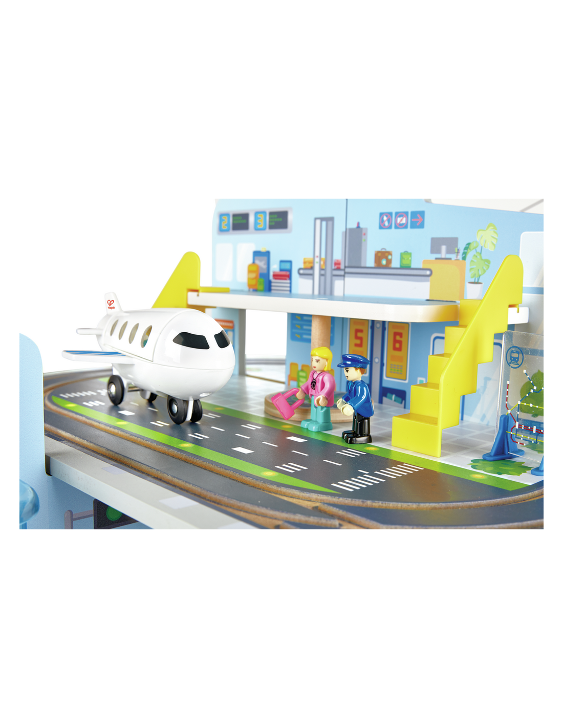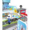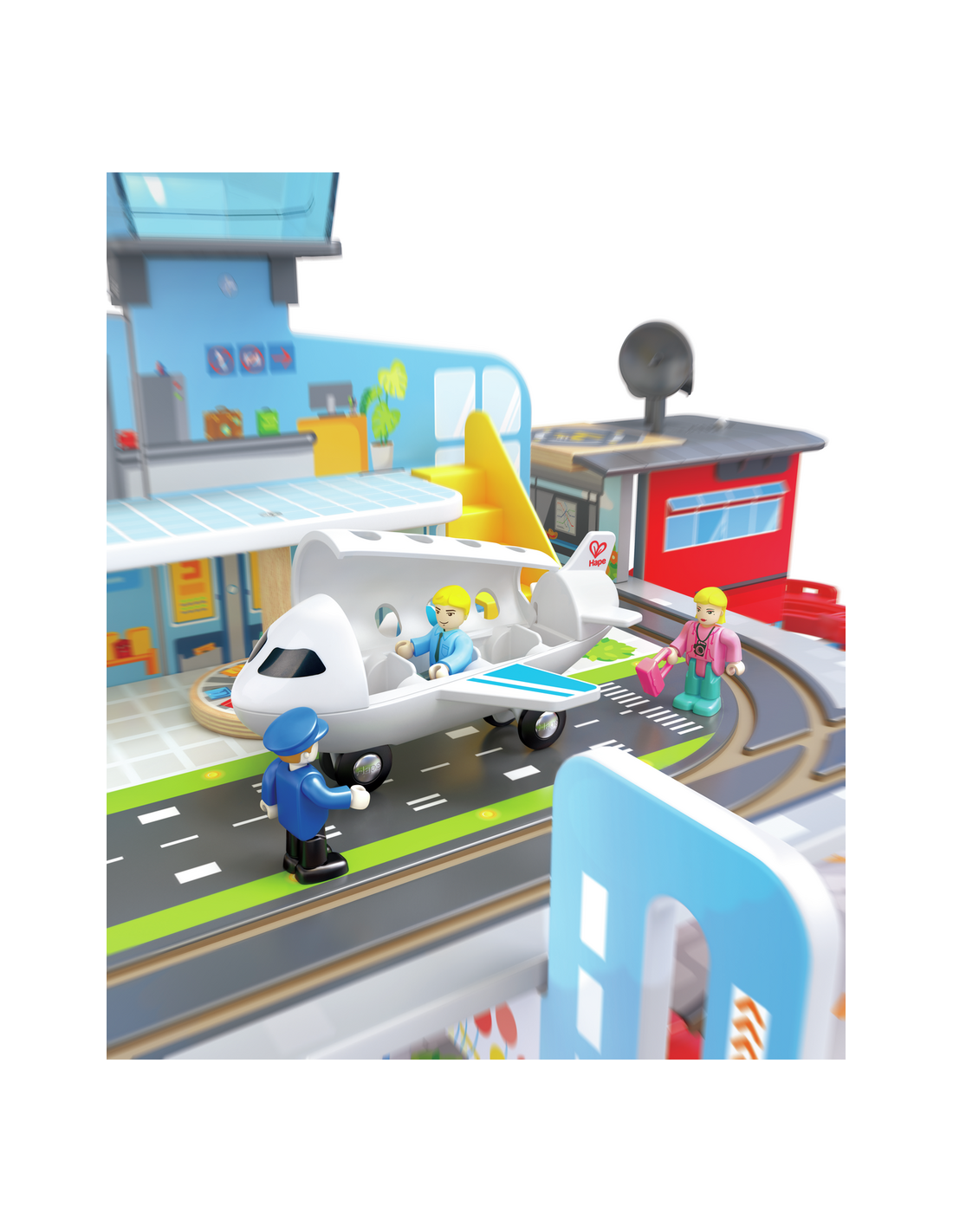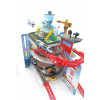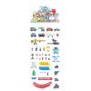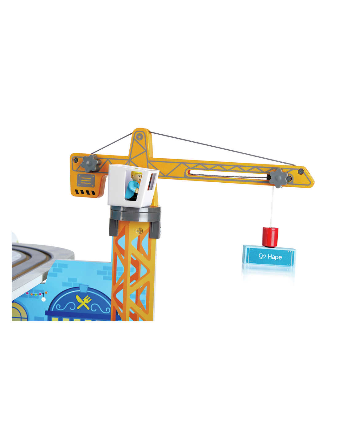E l área de juego incluye: una torre de vigilancia, una comisaría de policía, escaleras, un ascensor, un avión, un tren, un camión de bomberos, un camión con un bloque de carga, un disco giratorio, una grúa y figuras, vías de tren y tramos de carrete.