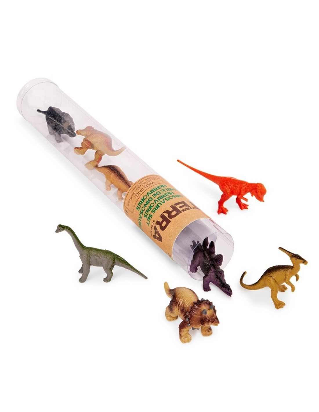 Una colección jurásica compacta: un tubo con 8 figuras de dinosaurios Terra, cada una de entre 6 y 11 centímetros, perfecta para explorar el mundo prehistórico de forma divertida y educativa.