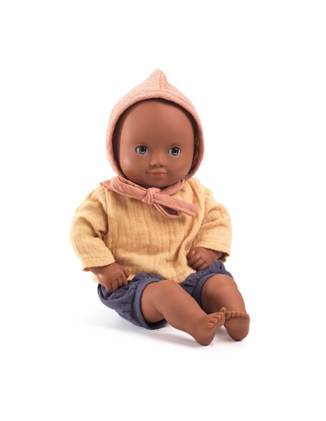 Con sus bonitos ojos negros y su atuendo a juego, Baby Mimosa es una muñeca para niños a partir de los 18 meses. Es ligera y su tamaño (32 cm) se adapta perfectamente a los brazos pequeños. Su cuerpo flexible, estampado con un bonito body, permite colocarla como un bebé de verdad. Su rostro, brazos y piernas están hechos de vinilo muy suave, agradable al tacto. Sus ojos se cierran cuando se la acuesta de espaldas. Este bebé está vestido con un pololo, una camisa y un gorrito de doble gasa 100 % algodón.
