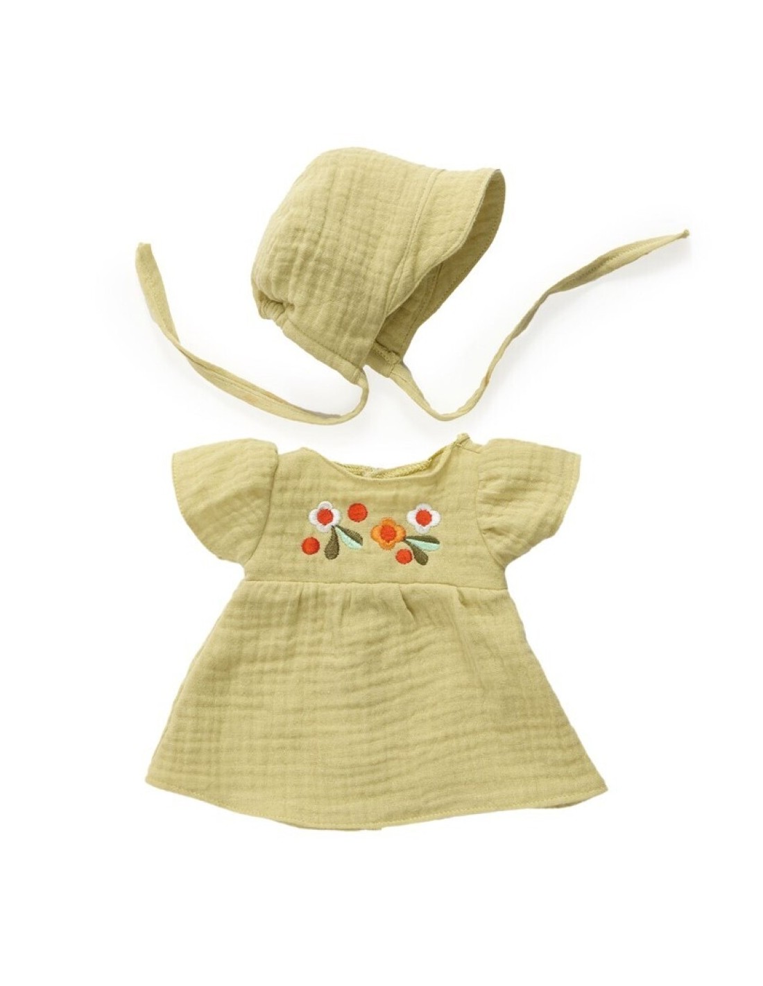 El Conjunto Lili Blum de la colección Pomea es una propuesta delicada y natural, pensada para vestir a las muñecas Lovely con un estilo suave y atemporal. Incluye un vestido de manga corta en algodón muselina, decorado con bordado floral en el pecho, y un gorro a juego que completa el conjunto con mucho encanto.