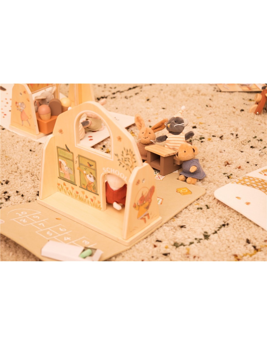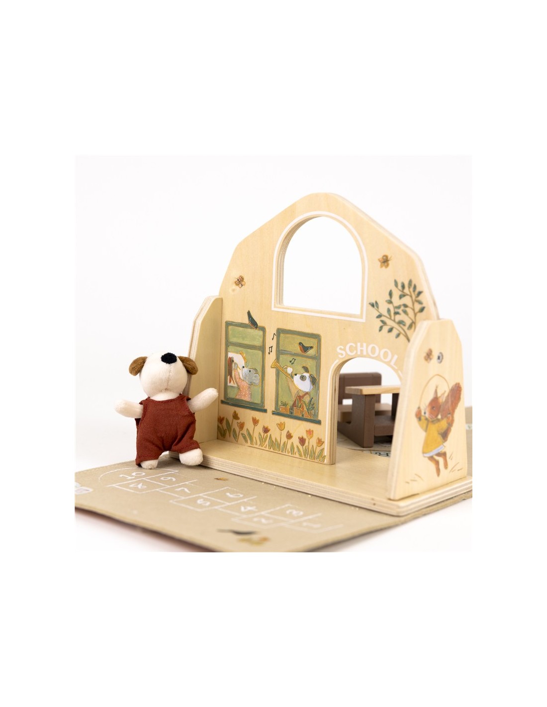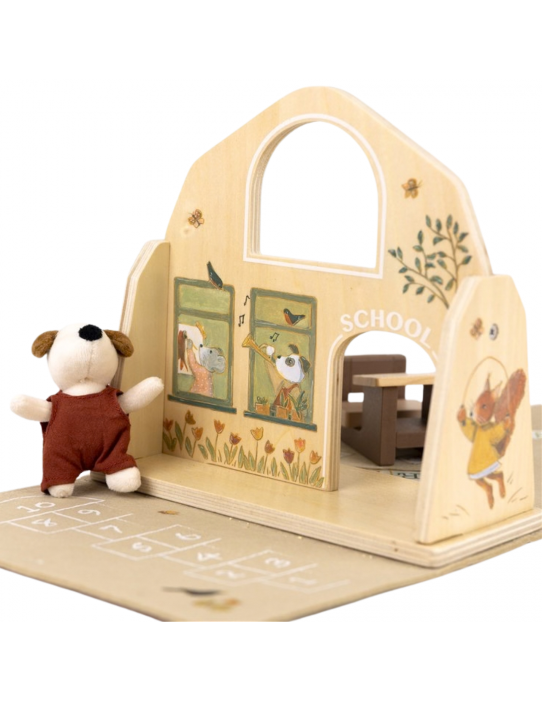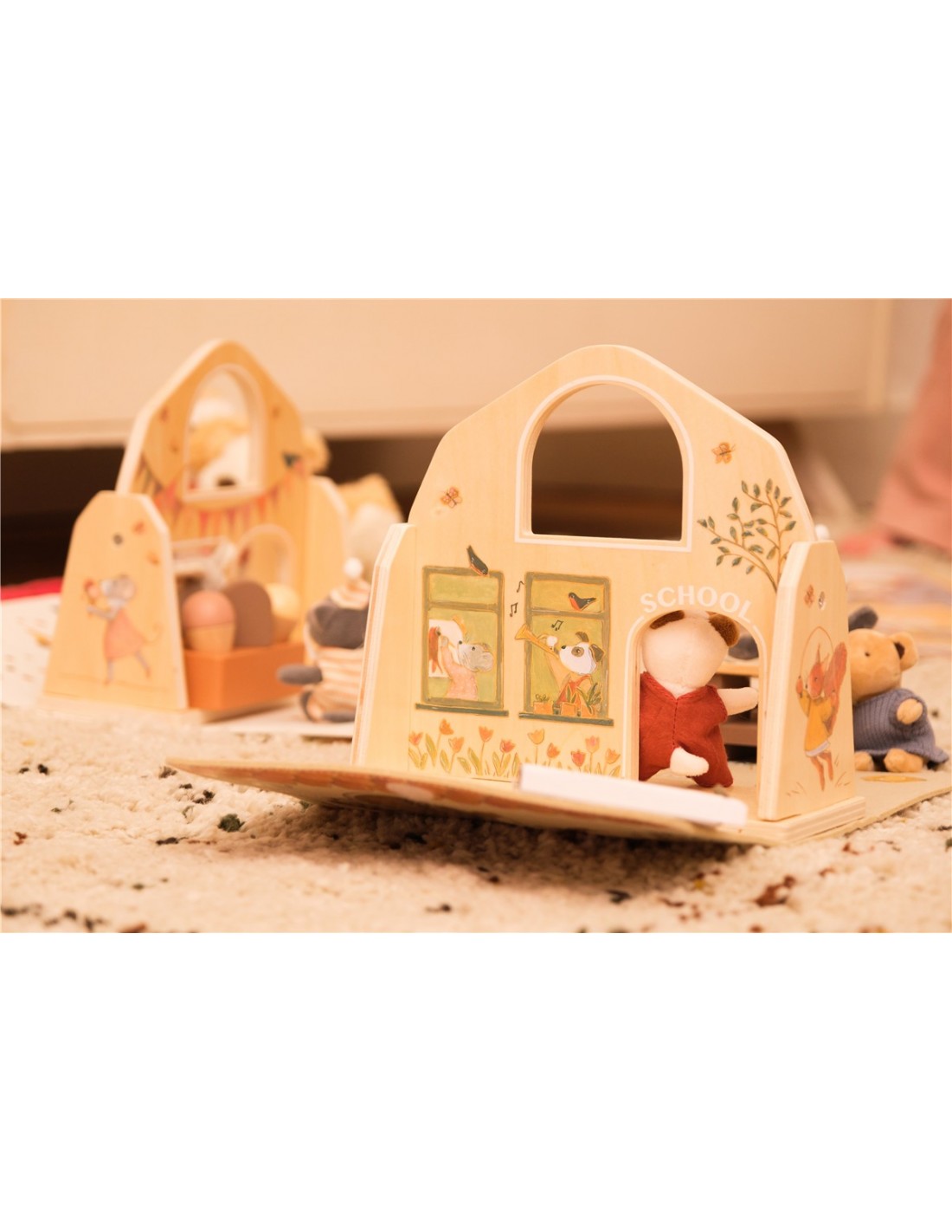 Este encantador colegio de madera invita a recrear historias del día a día: aprender, jugar, cantar o compartir momentos con los amigos. Su diseño cuidado y sus ilustraciones llenas de ternura crean un entorno cálido donde los pequeños personajes pueden reunirse, estudiar o divertirse en el recreo.