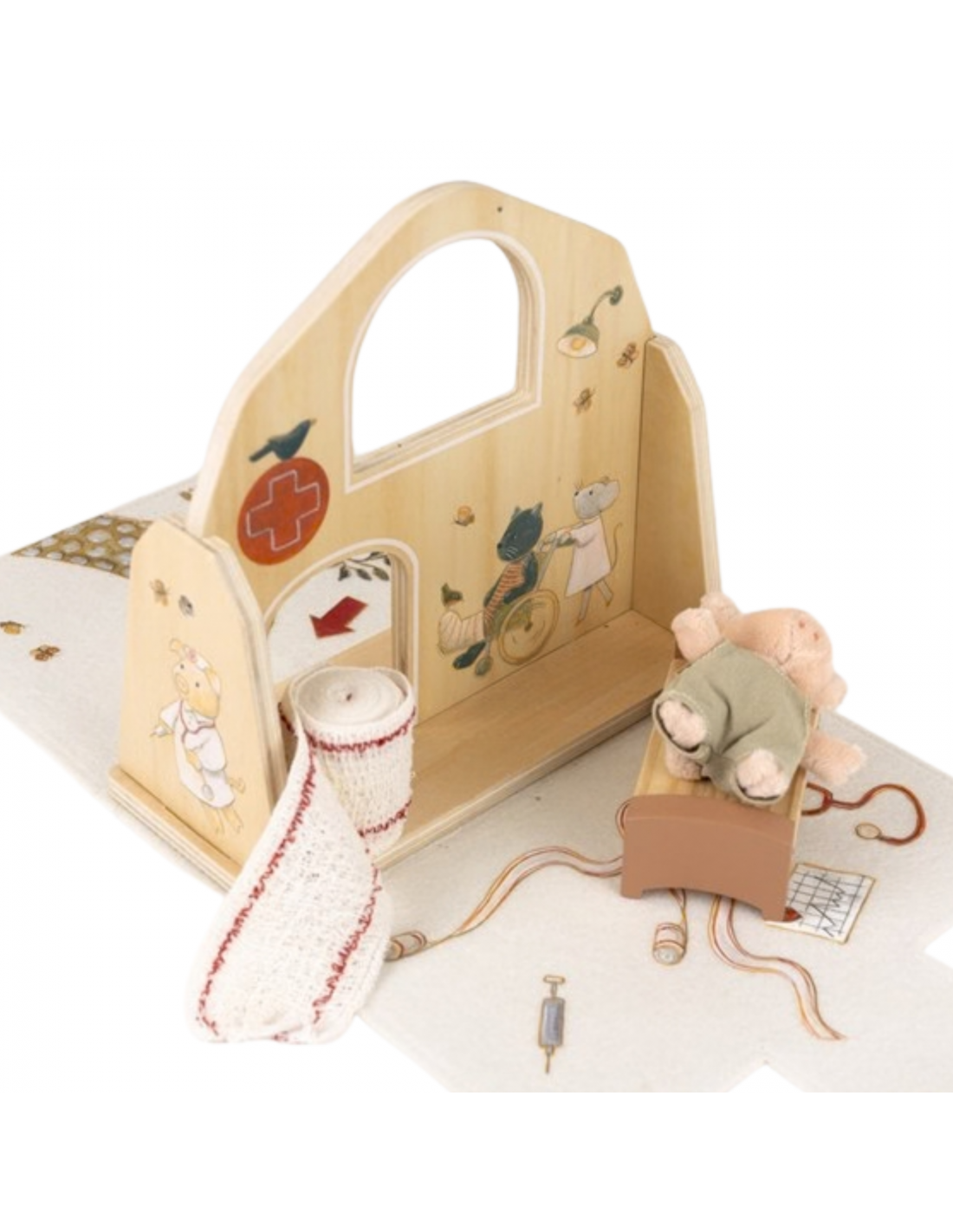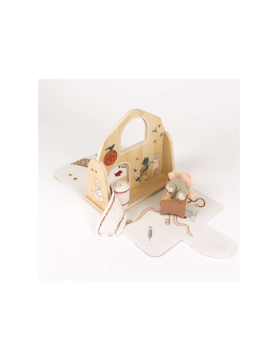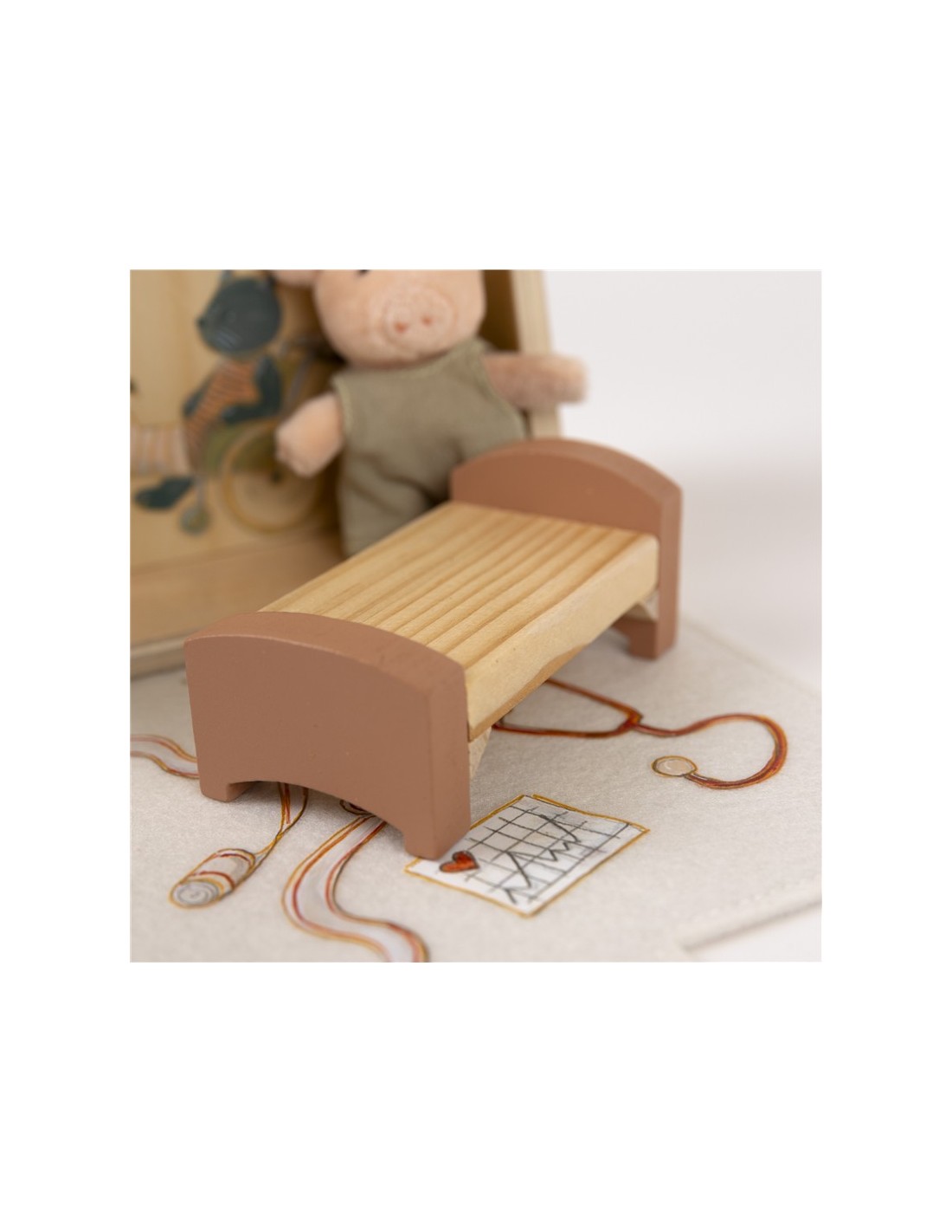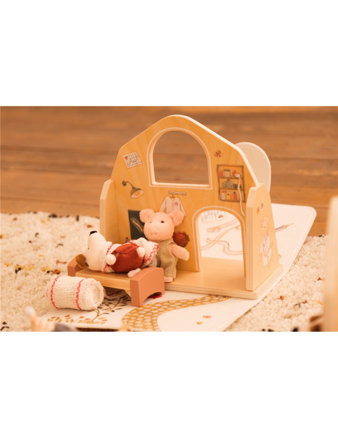 Este encantador hospital invita a recrear situaciones cotidianas como visitar al médico, cuidar a un amigo o ayudar a que alguien se sienta mejor. Con su camita y sus detalles ilustrados, se convierte en el lugar perfecto para inventar historias y fomentar el juego simbólico.