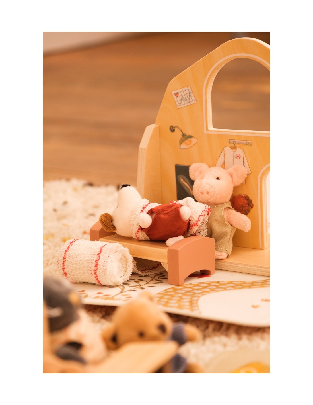 El Hospital de Mini Amigos es un precioso escenario de madera donde los pequeños personajes pueden cuidar unos de otros y vivir historias llenas de empatía y juego imaginativo.