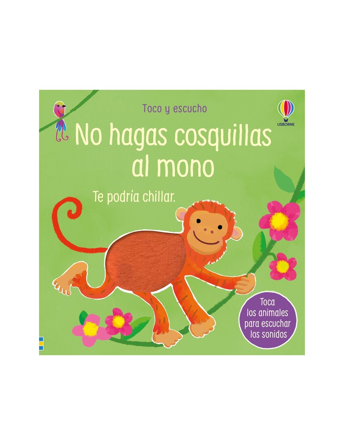 ¡Cuidado con hacerle cosquillas al monito… podría gritar! En este libro sensorial, los más pequeños tendrán ganas de tocar los distintos parches de textura para activar sonidos de animales. Cada textura corresponde a una criatura distinta: desde el mono hasta un jabalí, una hiena o un avestruz. Y al llegar a la última página… ¡todos los animales se alborotan al mismo tiempo!