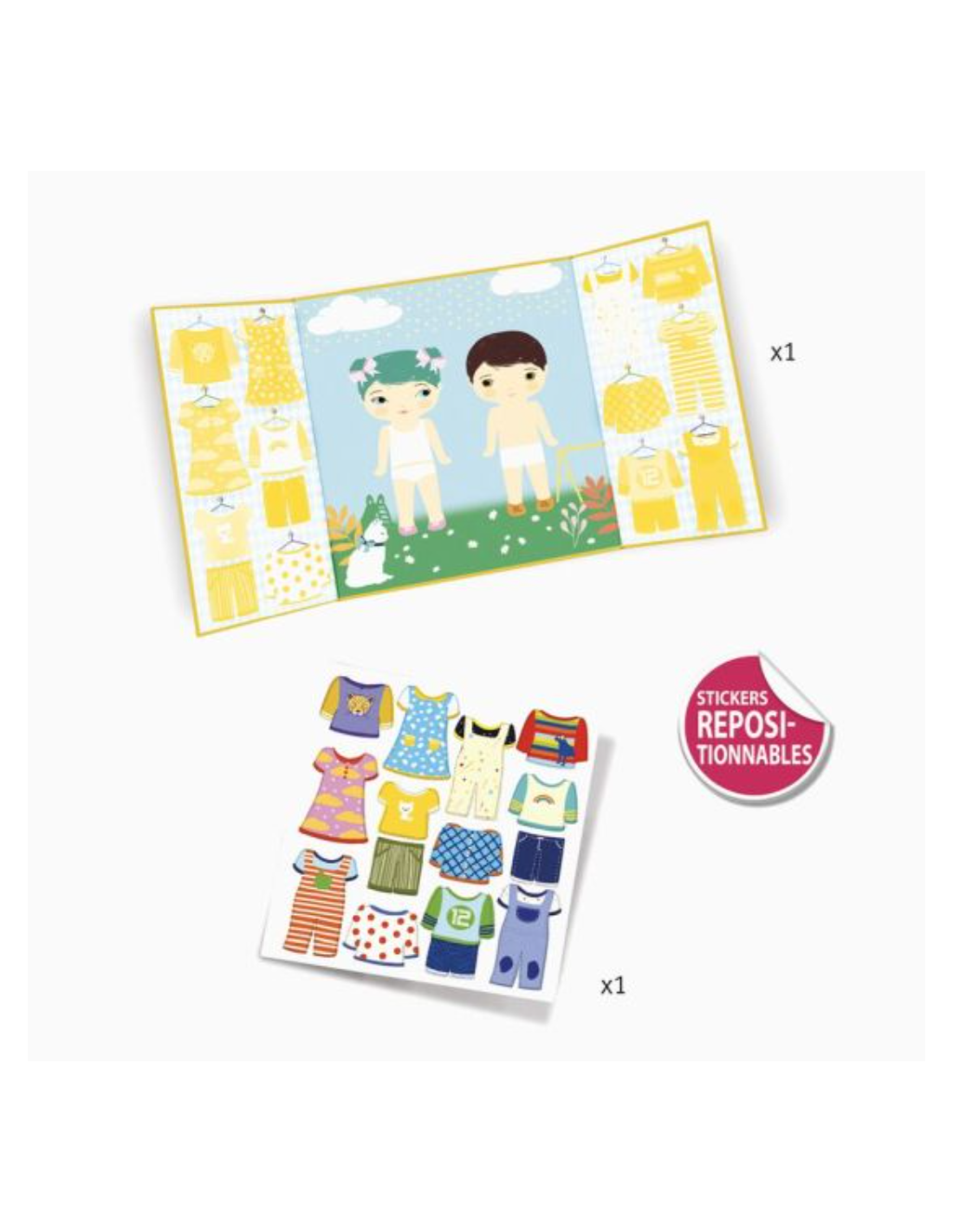 Set de escenario y pegatinas reutilizables para vestir a los personajes, de Djeco.
