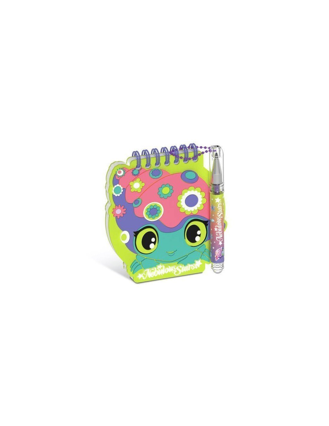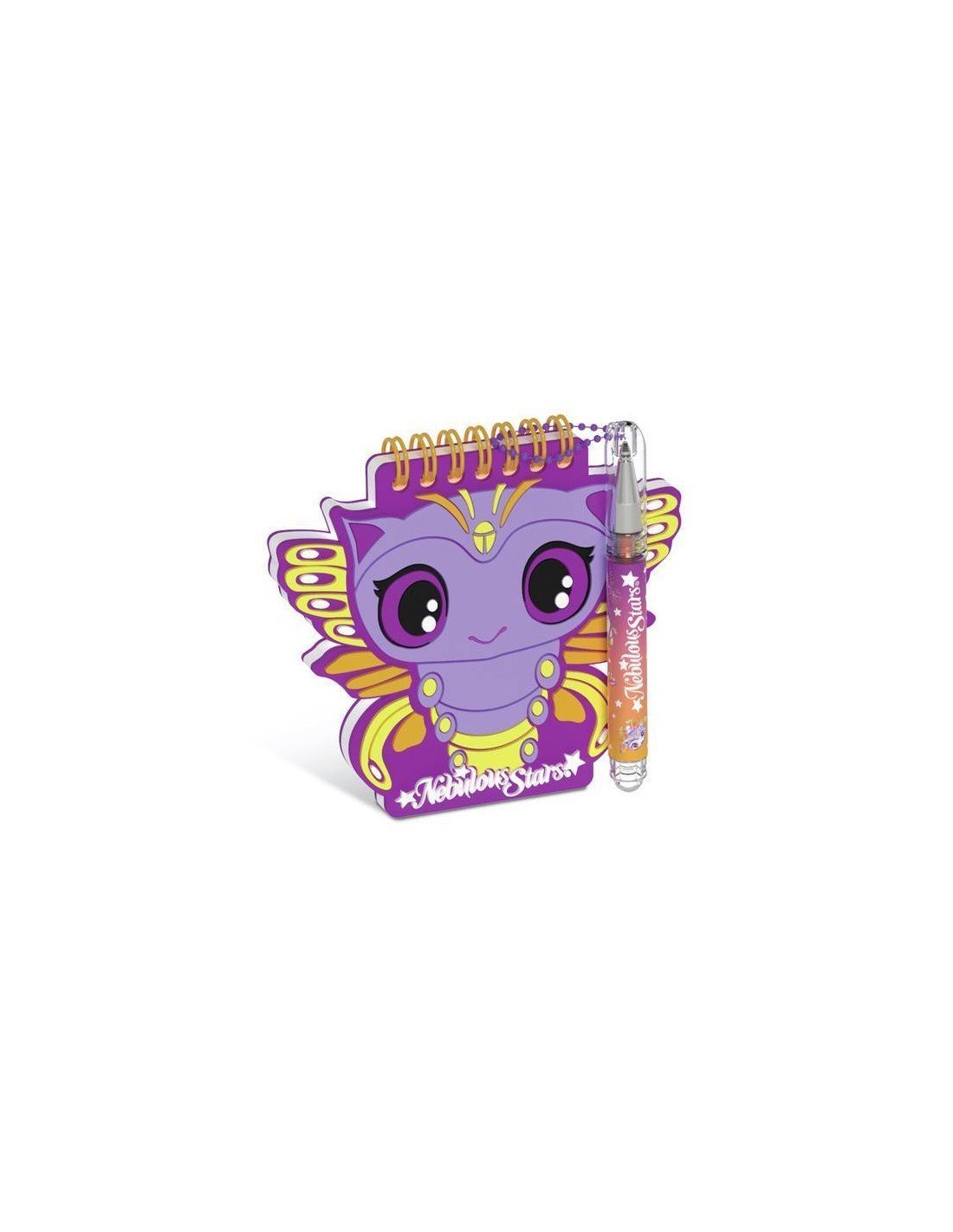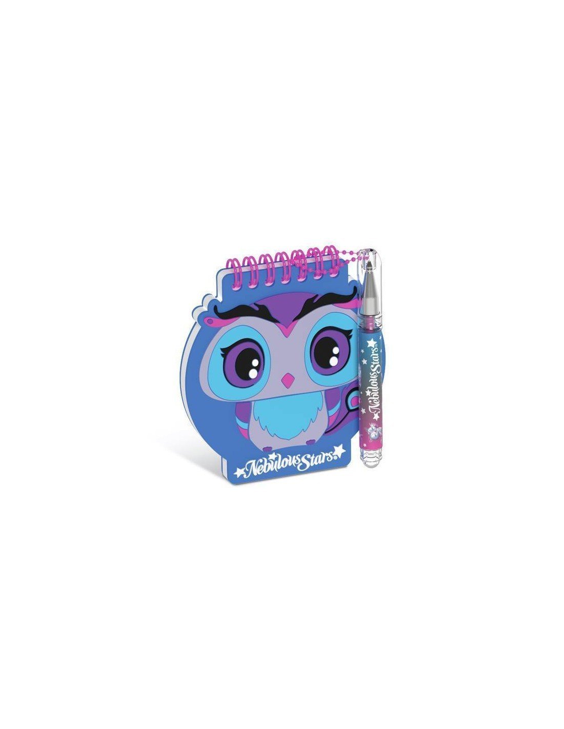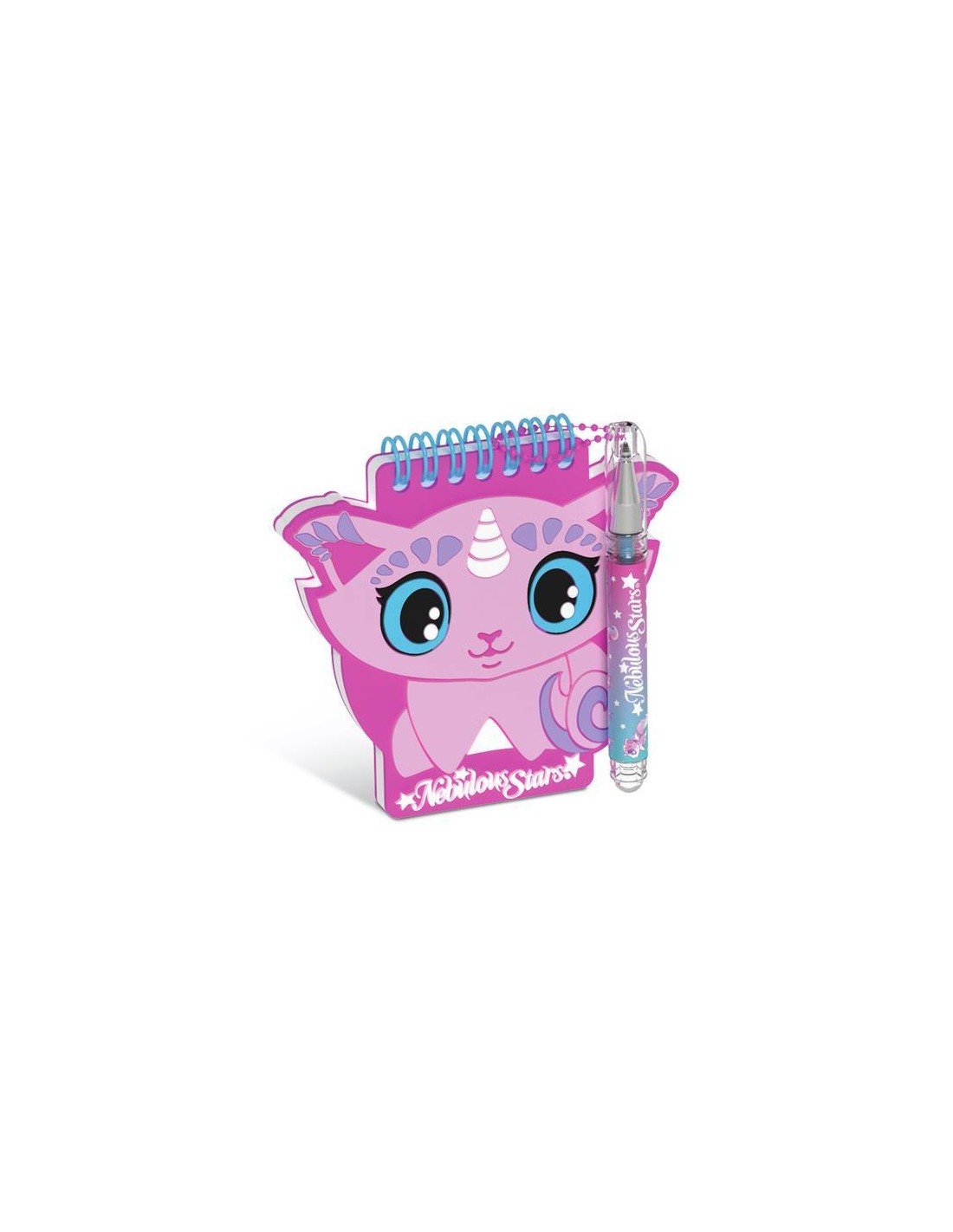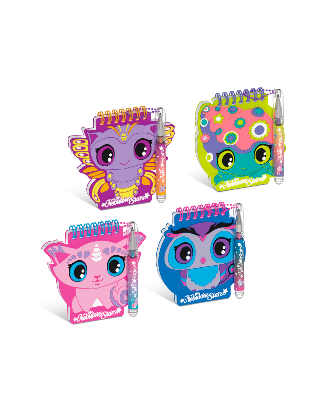 Pack de 4 mini libretas Nebulous. Estas libretas pequeñas incluyen un bolígrafo de tinta metálica con cadena y pegatinas.