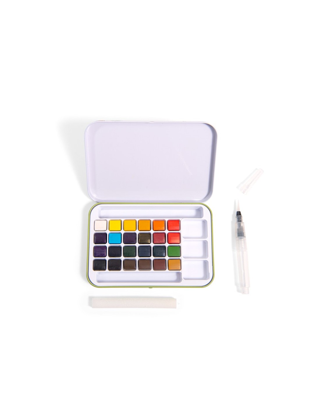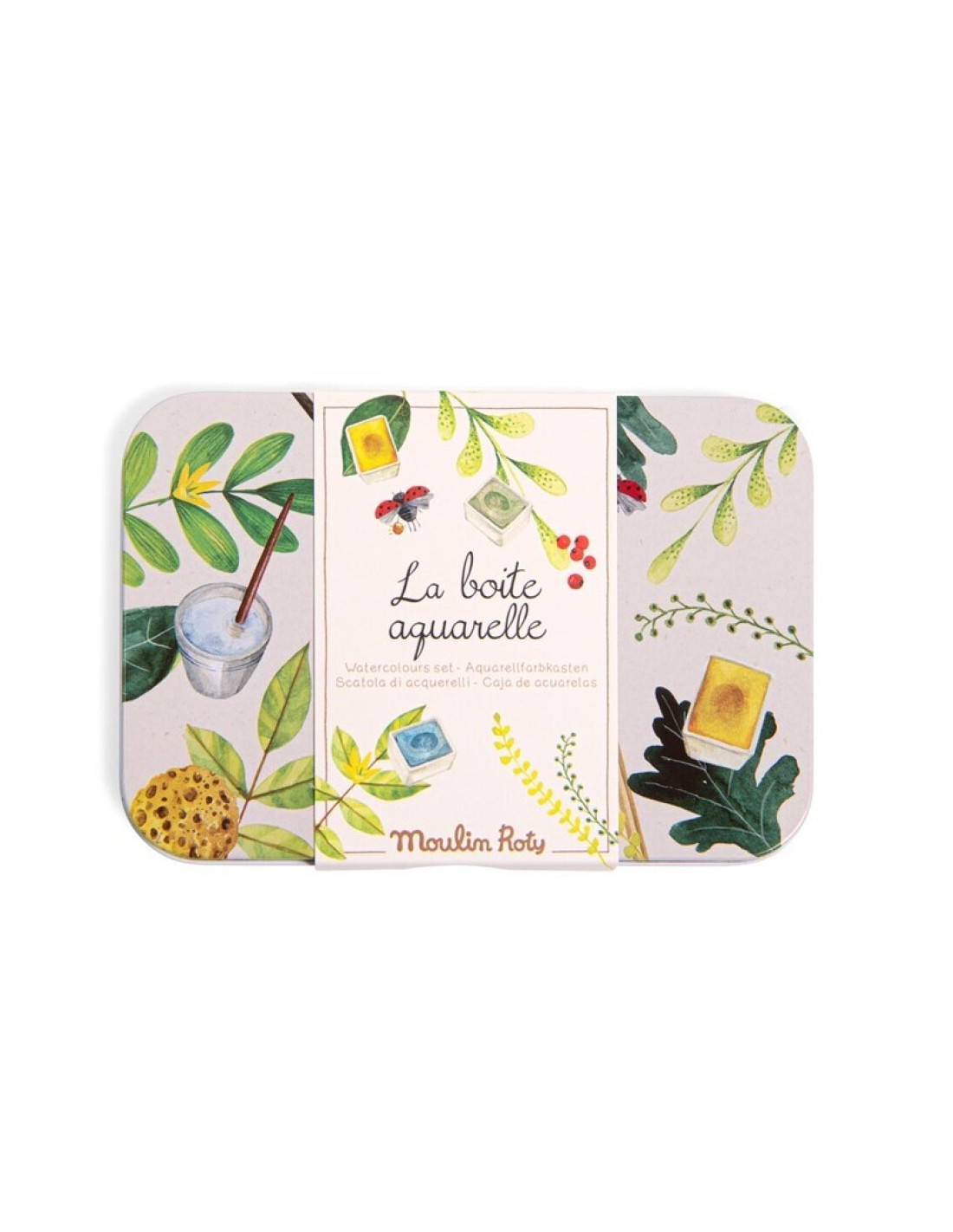 Esta preciosa caja metálica incluye una cuidada selección de acuarelas en distintos tonos, pincel con depósito de agua y esponja. Todo perfectamente organizado para que los peques puedan crear donde y cuando quieran.