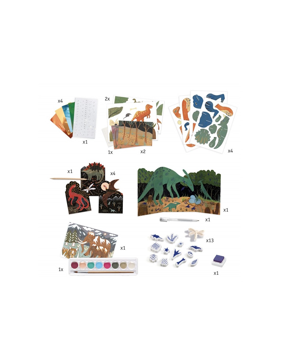 Incluye múltiples técnicas como colorear, montar figuras, estampar, decorar y crear escenas, permitiendo explorar distintas formas de expresión artística en un mismo set. Desde construir sus propios dinosaurios en 3D hasta personalizar ilustraciones con detalles únicos, cada actividad es una nueva aventura.